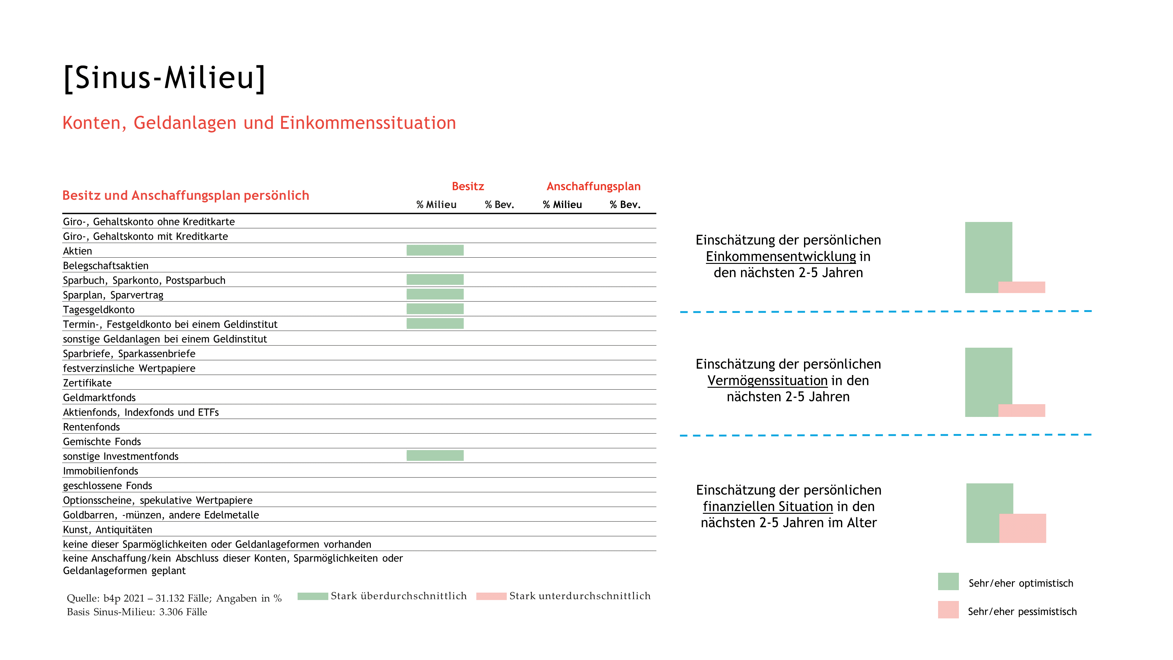 Das überarbeitete Infopaket „Finanzen und Versicherungen“ ist ab sofort erhältlich und zeigt, wie die aktualisierten Sinus-Milieus bzgl. Einstellungen zu Geld, Produktnutzung oder Sparverhalten ticken. Das Infopaket beinhaltet aktuellste Daten auf Basis der Markt-Media-Studie best4planning 2021 (über 30.000 Interviews).