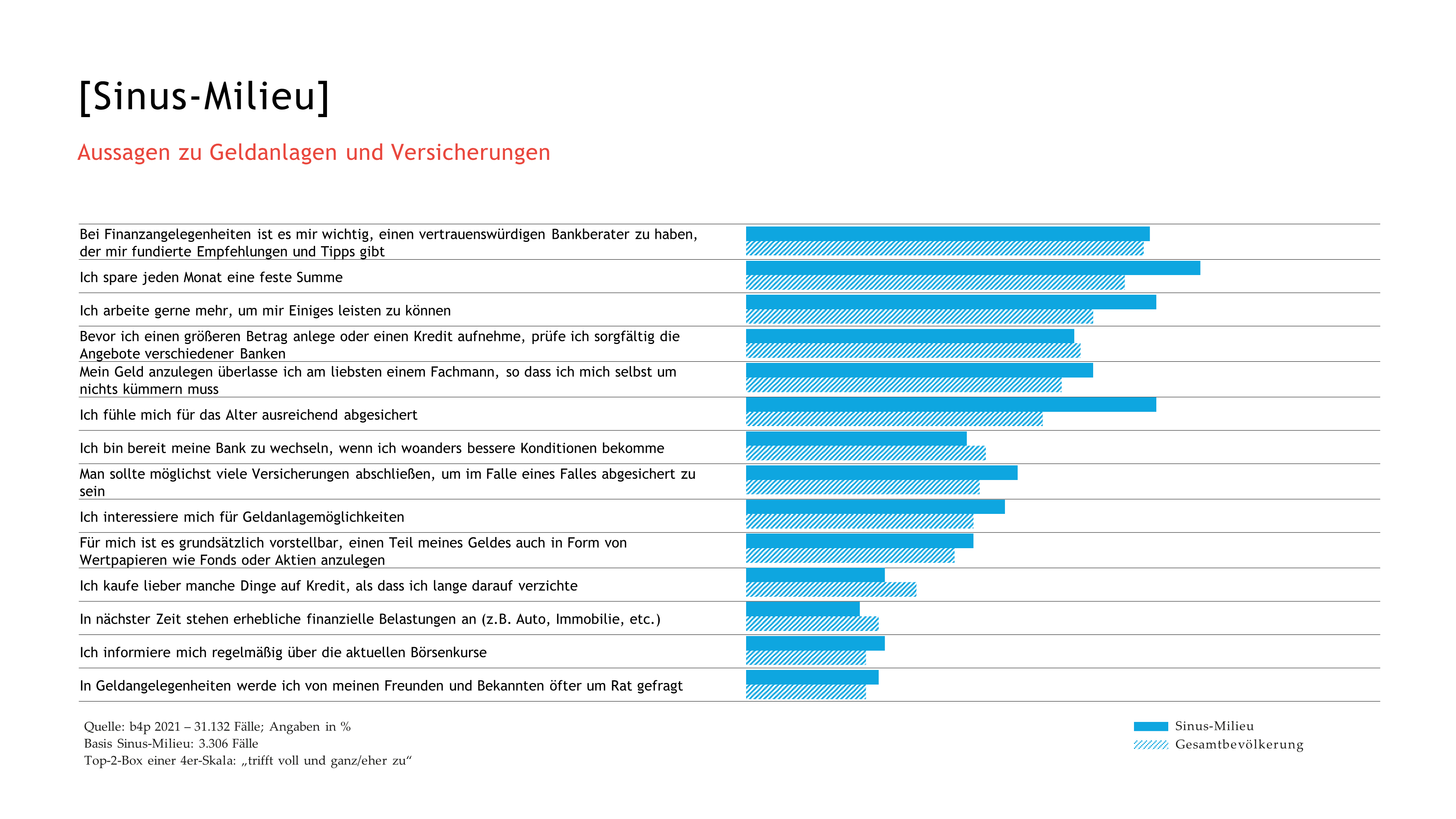 Wie viele andere Lebensbereiche auch, ist auch das Thema Finanzen stark durch die Wertewelt geprägt. Von der Haltung zum Thema Sparen über Risikobereitschaft bis hin zum Wunsch nach Beratung zeigen sich entsprechend deutliche Unterschiede unter Konsument*innen.