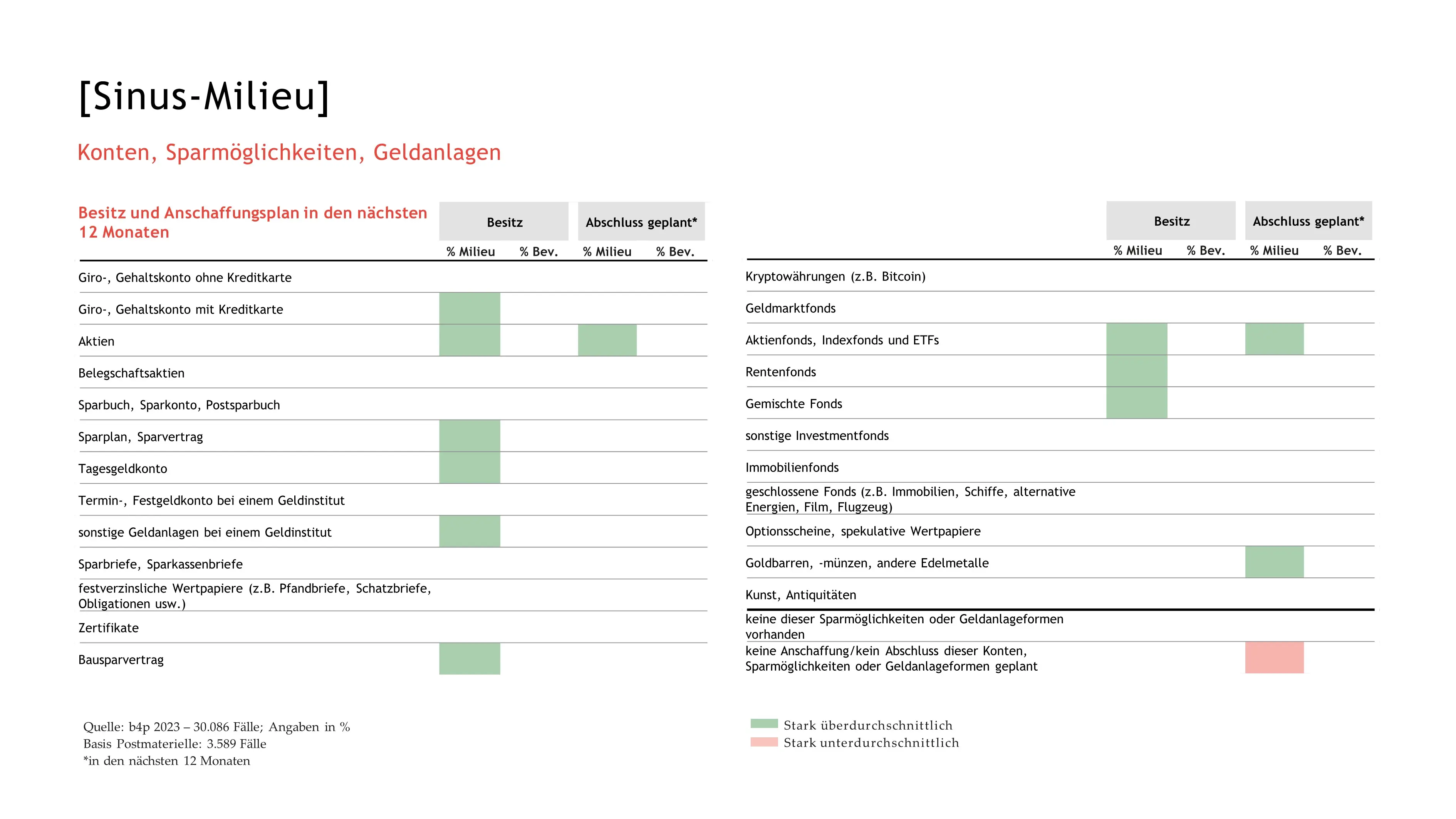 Das überarbeitete Infopaket „Finanzen und Versicherungen“ ist ab sofort erhältlich und zeigt, wie die Gesamtbevölkerung und die einzelnen Sinus-Milieus bzgl. Finanzen und Geldanlagen ticken, welche Finanzprodukte die Zielgruppen nutzen oder wie sie sich zum Thema Geldanlagen, Aktien und Fonds informieren. Das Infopaket beinhaltet aktuelle, repräsentative Daten auf Basis der Markt-Media-Studie best4planning 2023 (über 30.000 Interviews).