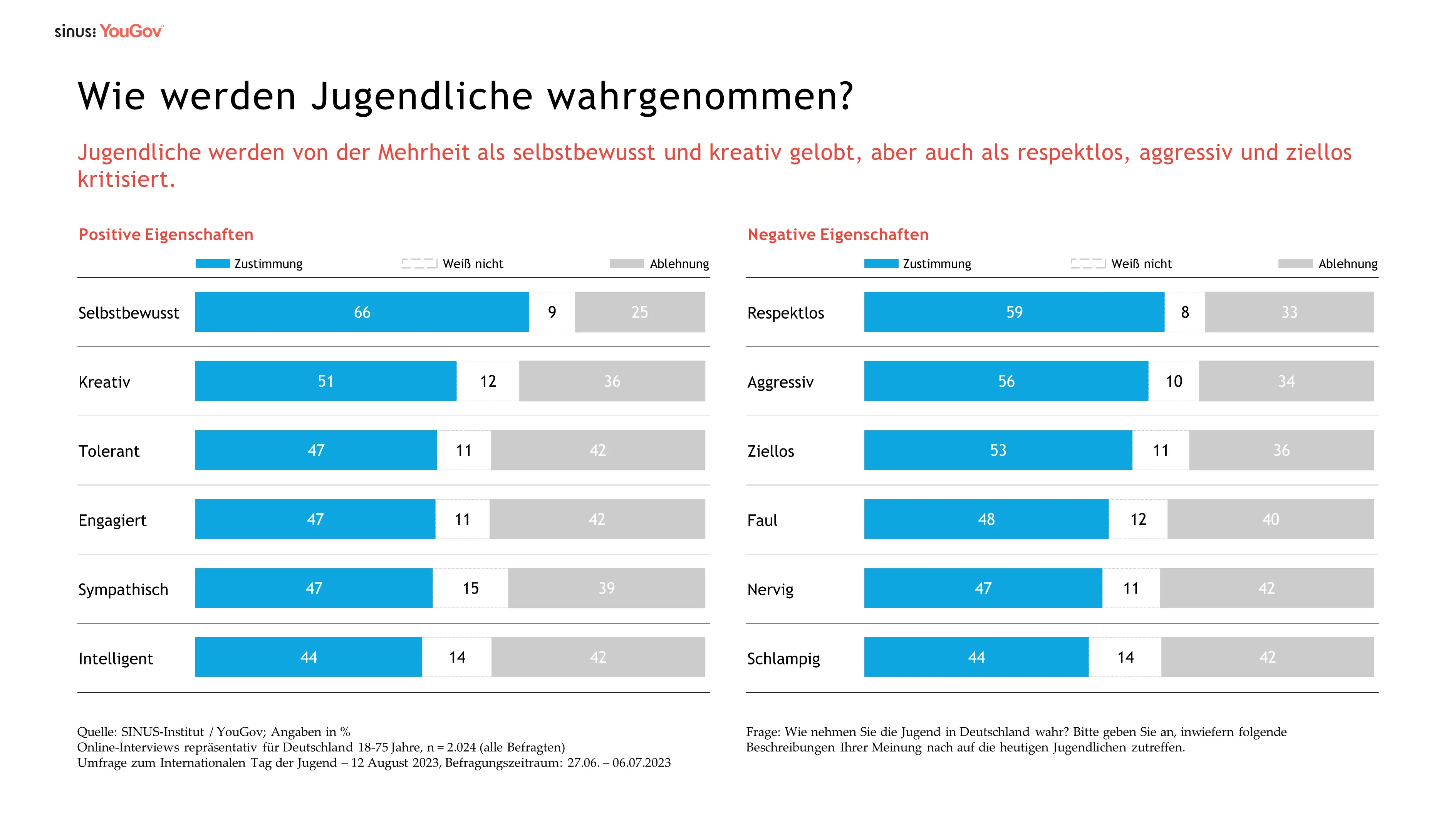 Doch wie nimmt die Bevölkerung die Jugendlichen derzeit wahr? Zwei Drittel der Deutschen finden, dass diese selbstbewusst sind (66 %). Auch sehen sie in ihnen kreative (51 %), sowie tolerante, engagierte und sympathische (jeweils 47 %) Persönlichkeiten.