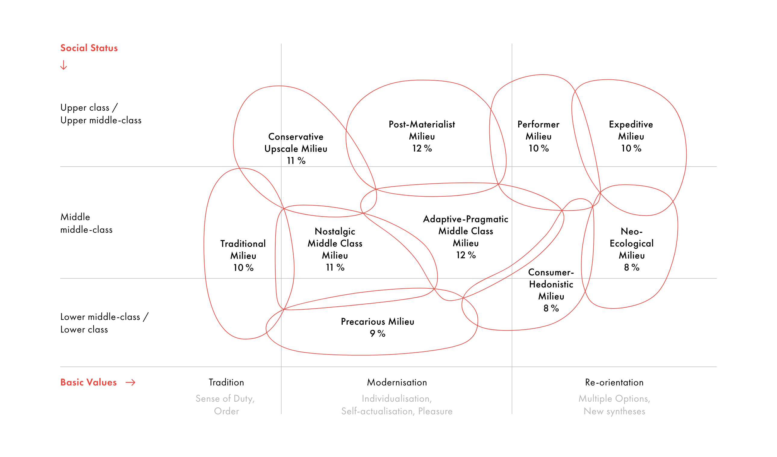 For four decades, SINUS-Institut has been researching people’s changing values and lifestyles. This has resulted in the Sinus-Milieus model, a “map” of society and its constituent target groups. The Sinus-Milieus reflect Germany’s new everyday social reality - shaped by political changes, digitalisation, populist movements, and the increasingly incontrovertible reality of climate change.