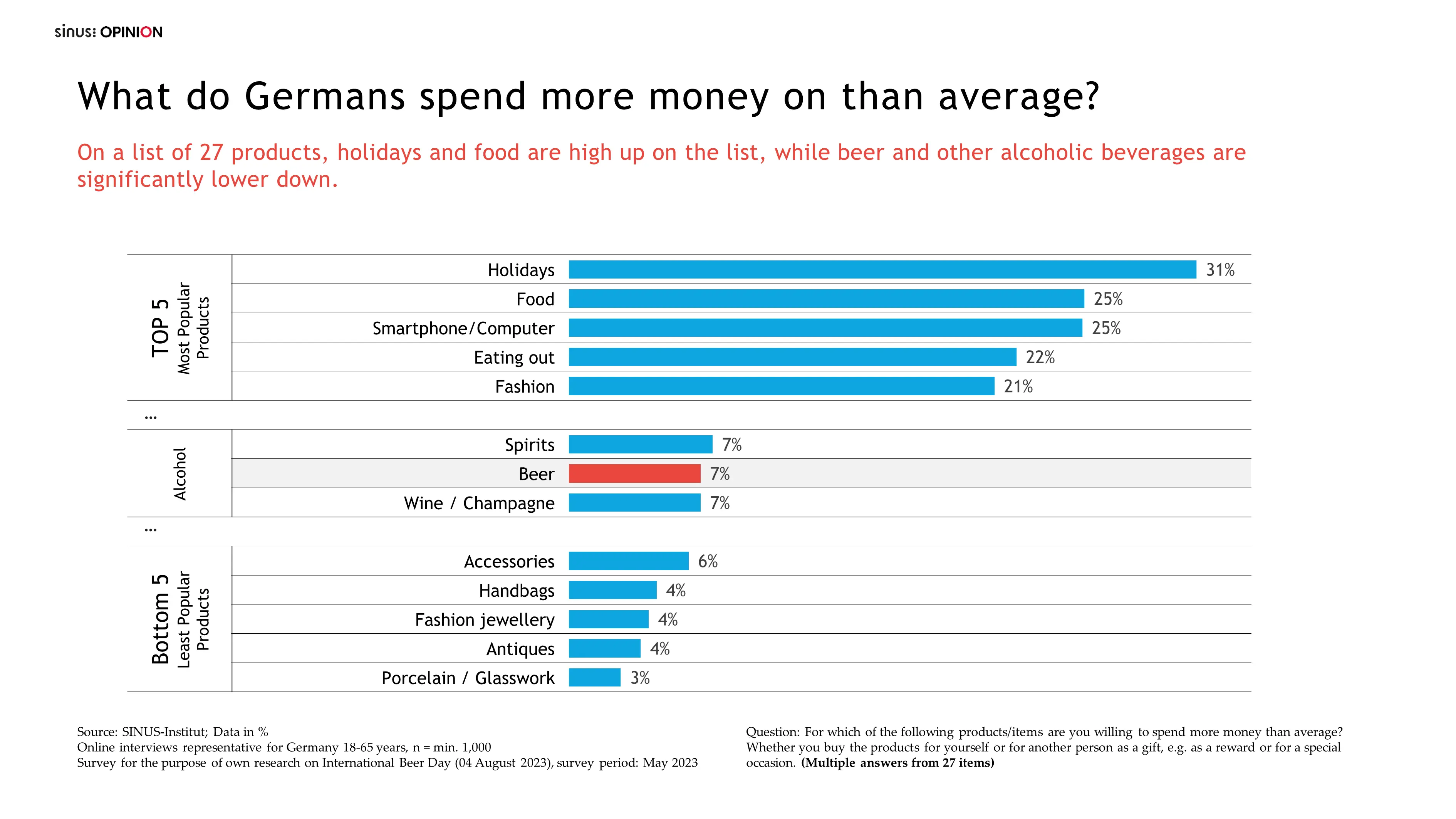 According to the survey, only 7% of respondents feel that they spend an above-average amount of money on beer, which puts this alcoholic beverage on position 19 out of 27 products. This means that only few respondents perceive their expenses for beer to be significantly different from those of their environment. In general, Germans´ demand for premium alcoholic beverages is not overly high, with wine (6%) and premium spirits like whiskey (7%) scoring similarly low. On the other hand, the greatest willingness to spend more is for holidays (31%), food for everyday consumption (25%), electrical appliances such as PCs or smartphones (25%), restaurant visits (22%) and fashion (21%).