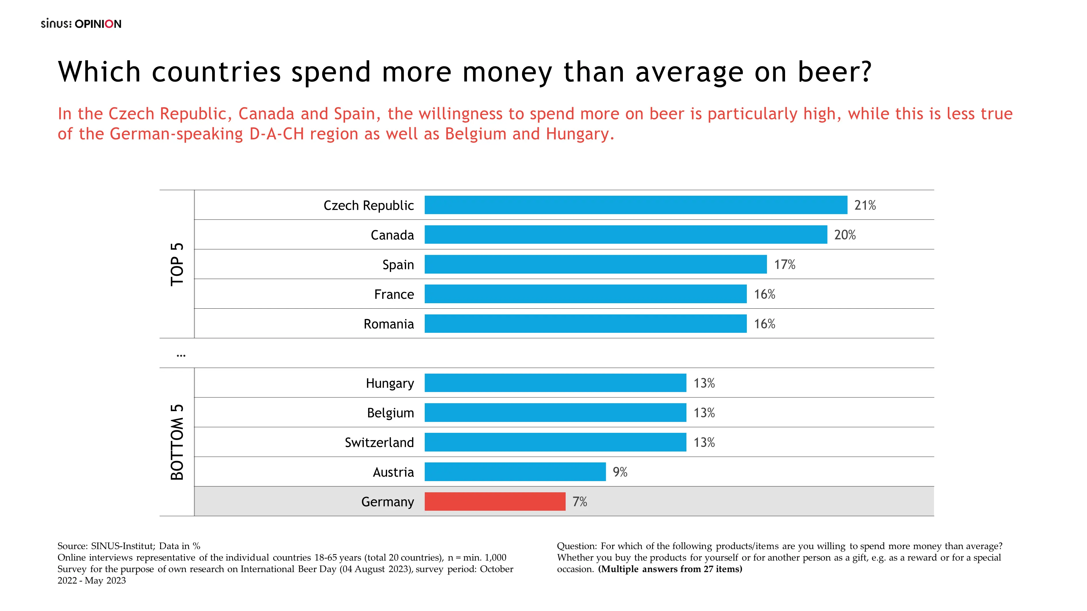 Germans seem to consider their beer sacred, and the population is correspondingly price-sensitive. In other markets, the willingness to spend above-average amounts of money on beer is significantly higher. In the Czech Republic (21%), Canada (20%), Spain (17%) and France (16%), for example, premium prices for beer are met with greater acceptance. However, this reluctance is not a purely German phenomenon: the premium demand is significantly lower in all German-speaking countries (Germany: 7%, Austria: 9%, Switzerland: 13%).