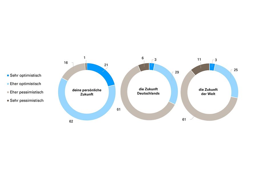 Insgesamt blickt die große Mehrheit der Jugendlichen im Alter von 14-17 Jahren eher pessimistisch oder sogar sehr pessimistisch auf die Zukunft Deutschlands (67 Prozent) und der Welt (72 Prozent). Trotzdem sind 83 Prozent mit Blick auf ihre persönliche Zukunft eher oder sogar sehr optimistisch.