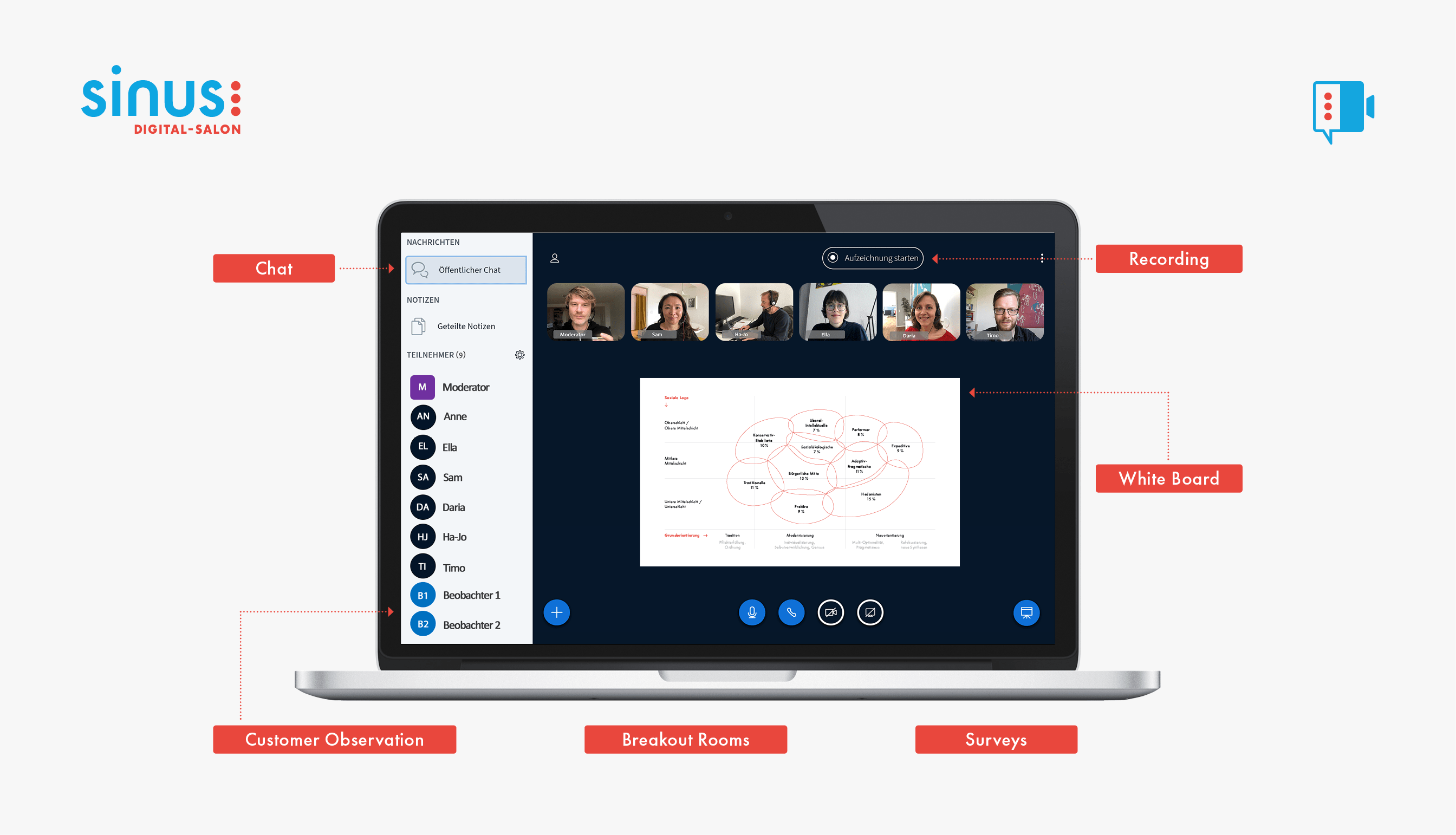 SINUS Digital-Salon is our solution for qualitative research when an online format is desired or necessary due to external circumstances. Our Digital-Salon tool is versatile and individually applicable - for example for