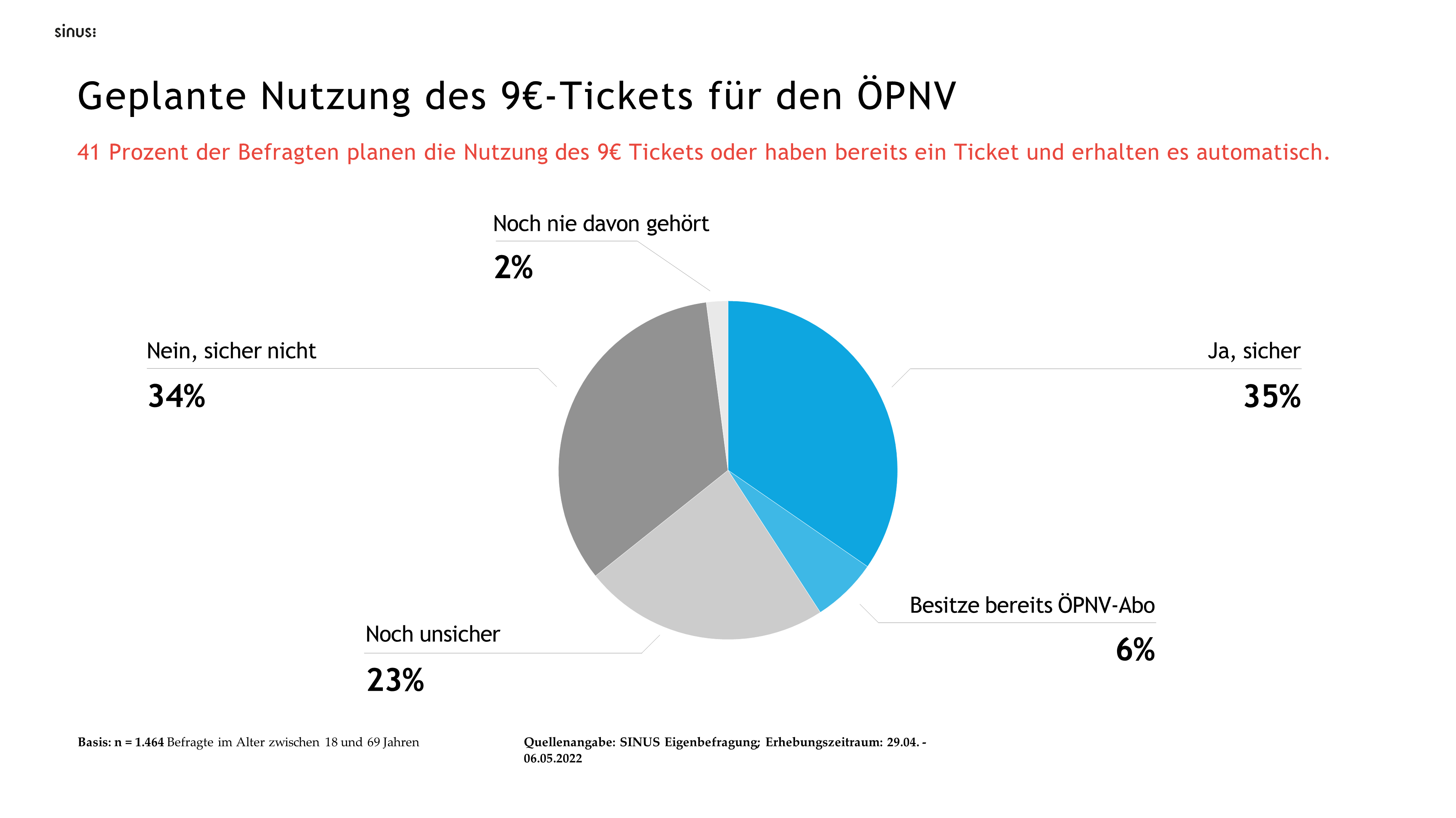 Ein Drittel (35%) aller Befragten geben in einer repräsentativen Online-Befragung des SINUS-Instituts zwischen Ende April und Anfang Mai 2022 an, das Aktionsticket sicher nutzen zu wollen. Hinzu kommen weitere 6%, die bereits ein Abo besitzen und damit das 9€-Ticket automatisch nutzen werden. Zusammen entspricht dies ca. 22,8 Mio. Menschen in Deutschland, die das 9€-Ticket voraussichtlich nutzen werden 23% waren zum Befragungszeitpunkt noch unentschlossen, ob sie das Ticket nutzen wollen, und 34% schlossen dies für sich aus.