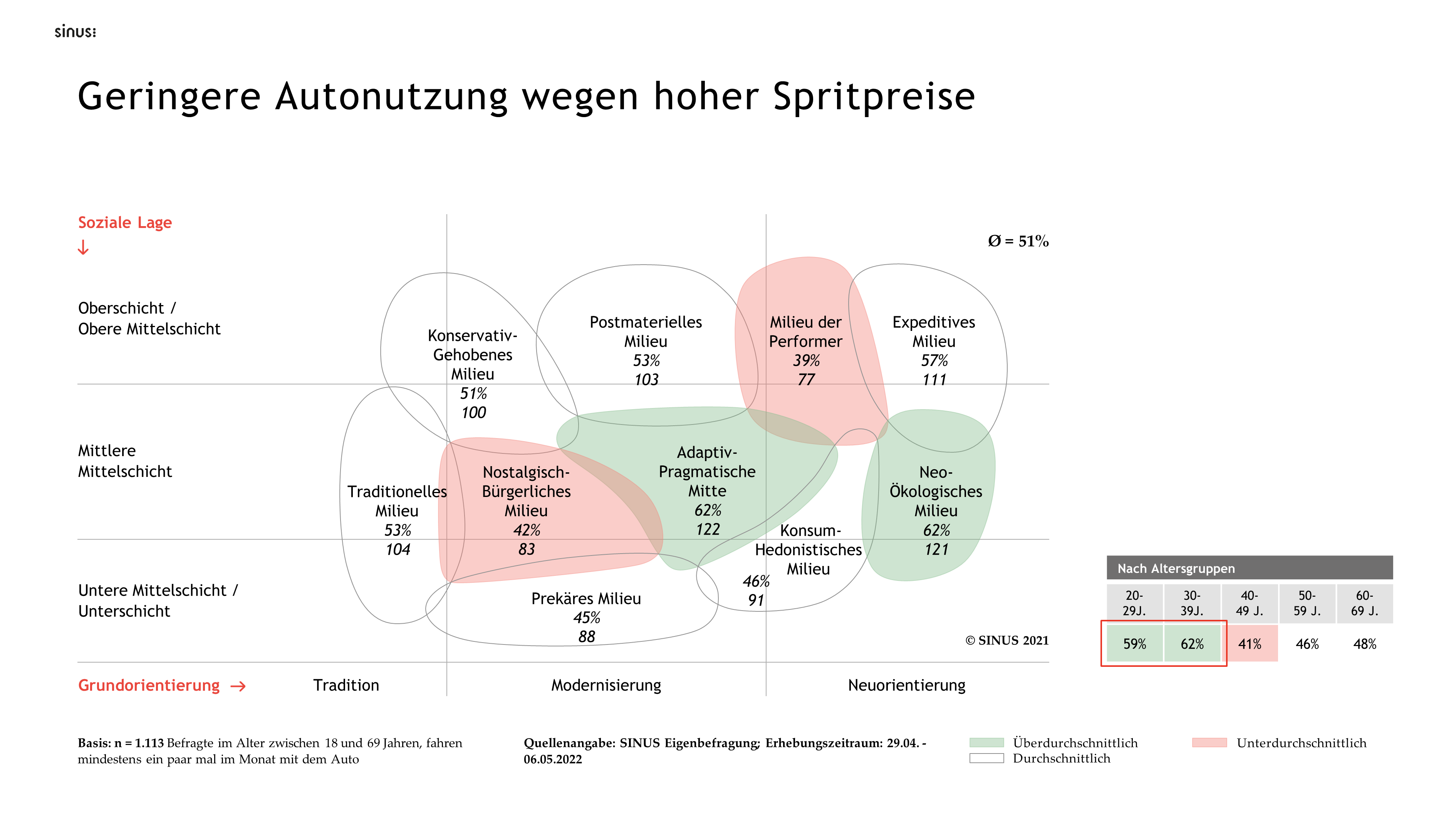 Die hohen Spritkosten im Frühjahr 2022 haben viele Autofahrende zum Umdenken gebracht. Jede*r 2. Autofahrende (51 %) gibt an, das Auto derzeit seltener zu nutzen. Besonders häufig trifft dies auf eher jüngere Personen aus den Sinus-Milieus der Adaptiv-Pragmatischen Mitte und den Neo-Ökologischen zu. In diesen Gruppen nutzen aufgrund hoher Spritpreise 62% das Auto seltener als üblicherweise.
