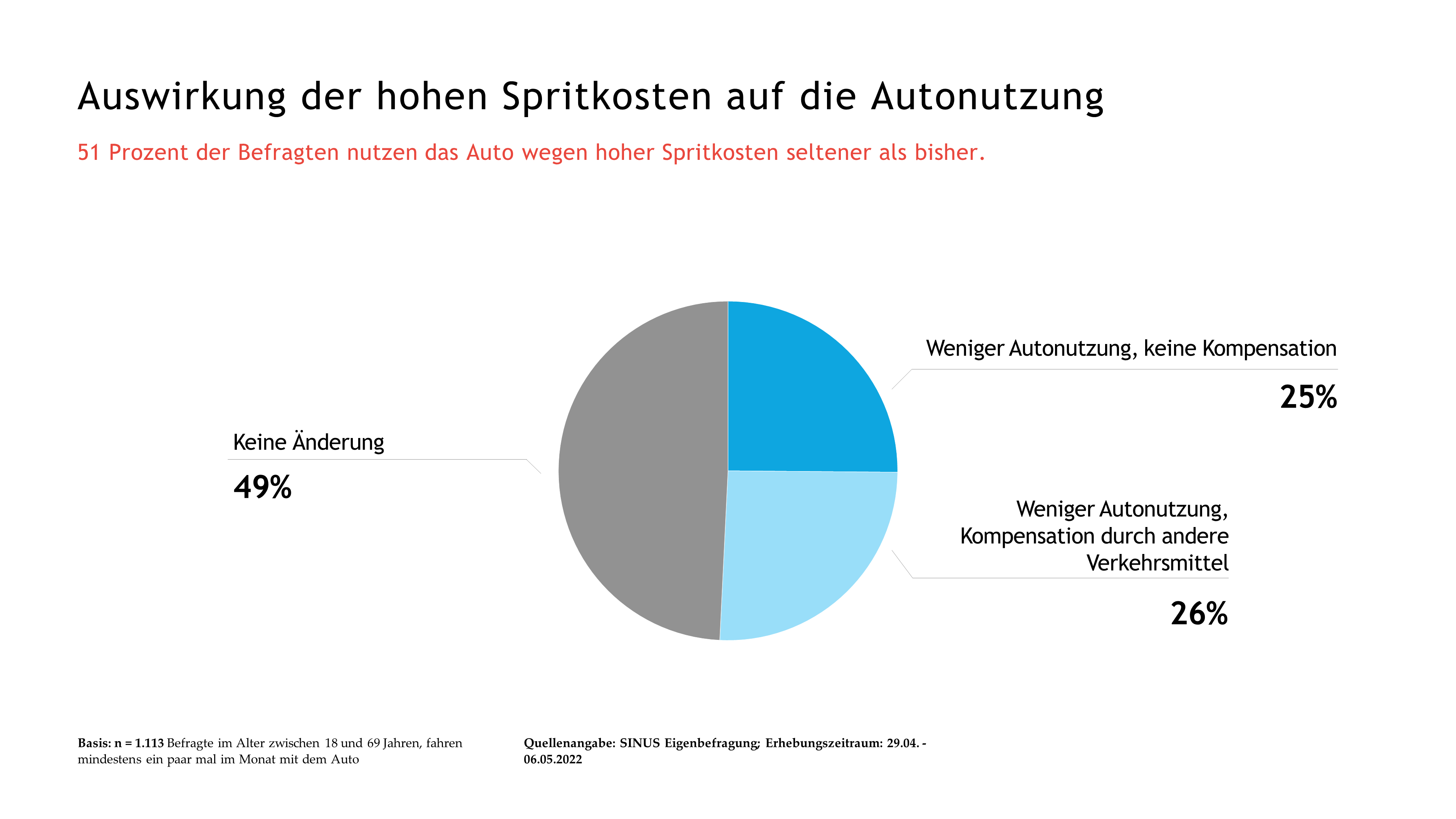 Die Lösungsstrategien fallen unterschiedlich aus. Ein Viertel der Autofahrenden (25%) schränkt seine Mobilität grundsätzlich ein, fährt also weniger Auto ohne häufiger auf andere Verkehrsmittel zurückzugreifen. Ein weiteres Viertel (26%) fährt weniger Auto und nutzt stattdessen häufiger andere Fortbewegungsmittel wie das Fahrrad, den Bus oder die Bahn.