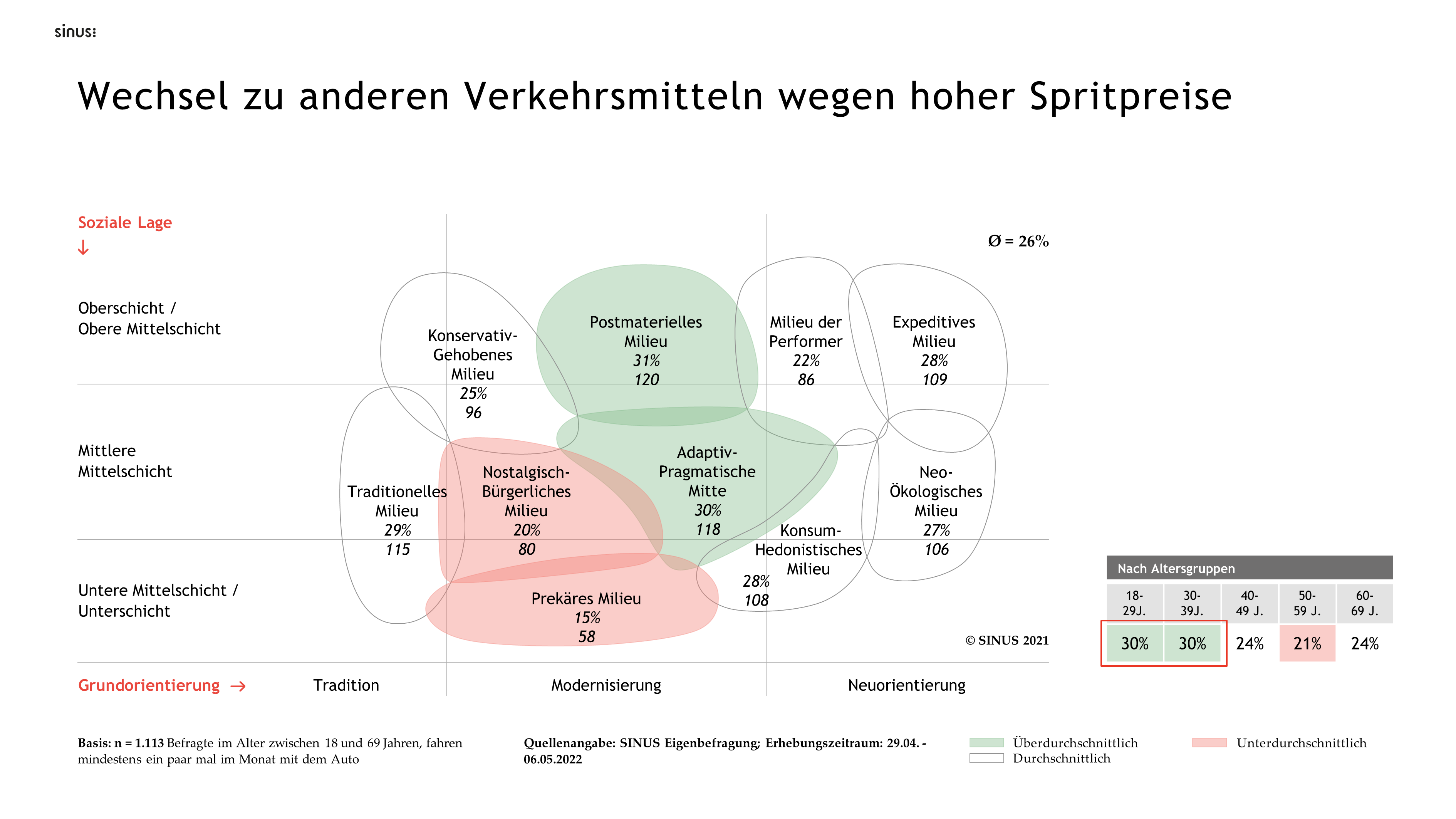 Überdurchschnittlich viele dieser Verkehrsmittelwechsler finden sich in jüngeren Altersgruppen unter 40 Jahren (30%), Personen mit einem formal hohem Bildungsniveau (29%) und in den Sinus-Milieus der Postmateriellen (31%) und der Adaptiv-Pragmatischen Mitte (30%). Bei den Postmateriellen handelt es sich um ein sehr umweltbewusstes Milieu, das auch schon vor der Ukraine-Krise und den hohen Spritpreisen seltener und nur mit einem schlechtem Gewissen Auto fuhr und nun aus Überzeugung häufiger aufs Rad oder die Bahn umsteigt. Die Adaptiv-Pragmatische Mitte passt sich – milieutypisch – den neuen Gegebenheiten an, um den Geldbeutel zu schonen.