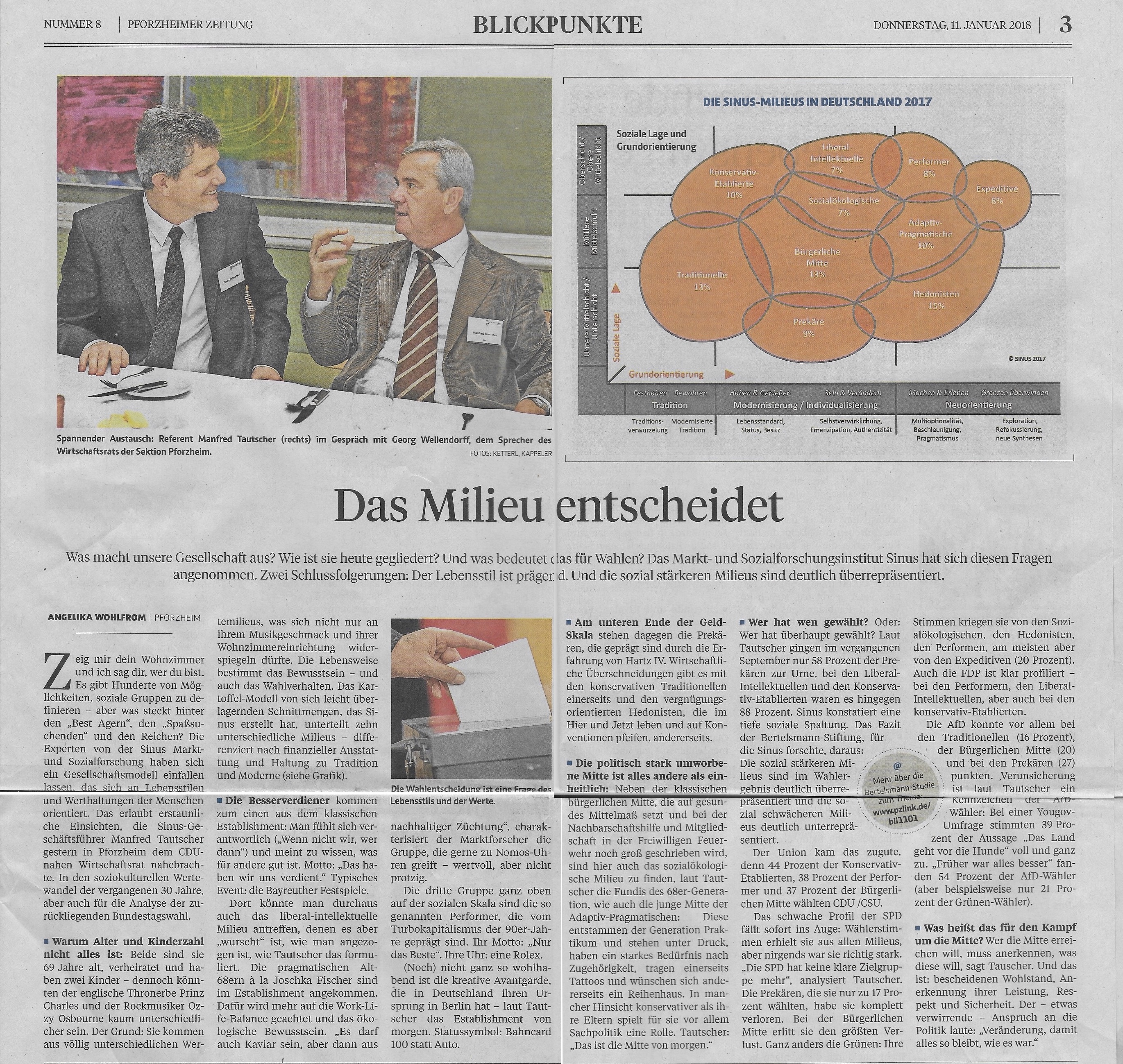 „Wer die Mitte erreichen will, muss anerkennen, was diese will: bescheidenen Wohlstand, Anerkennung ihrer Leistung, Respekt und Sicherheit“, so Manfred Tautscher, Geschäftsführer des SINUS-Instituts, bei einem Vortrag beim CDU-nahen Wirtschafsrat Pforzheim am 10. Januar. Die Mitte sehne sich nach Veränderung – damit alles so bleibt wie es war. Das heißt, die Politik müsse die Zukunft so gestalten, dass sich für die Mitte der Gesellschaft nicht allzu viel verändert.