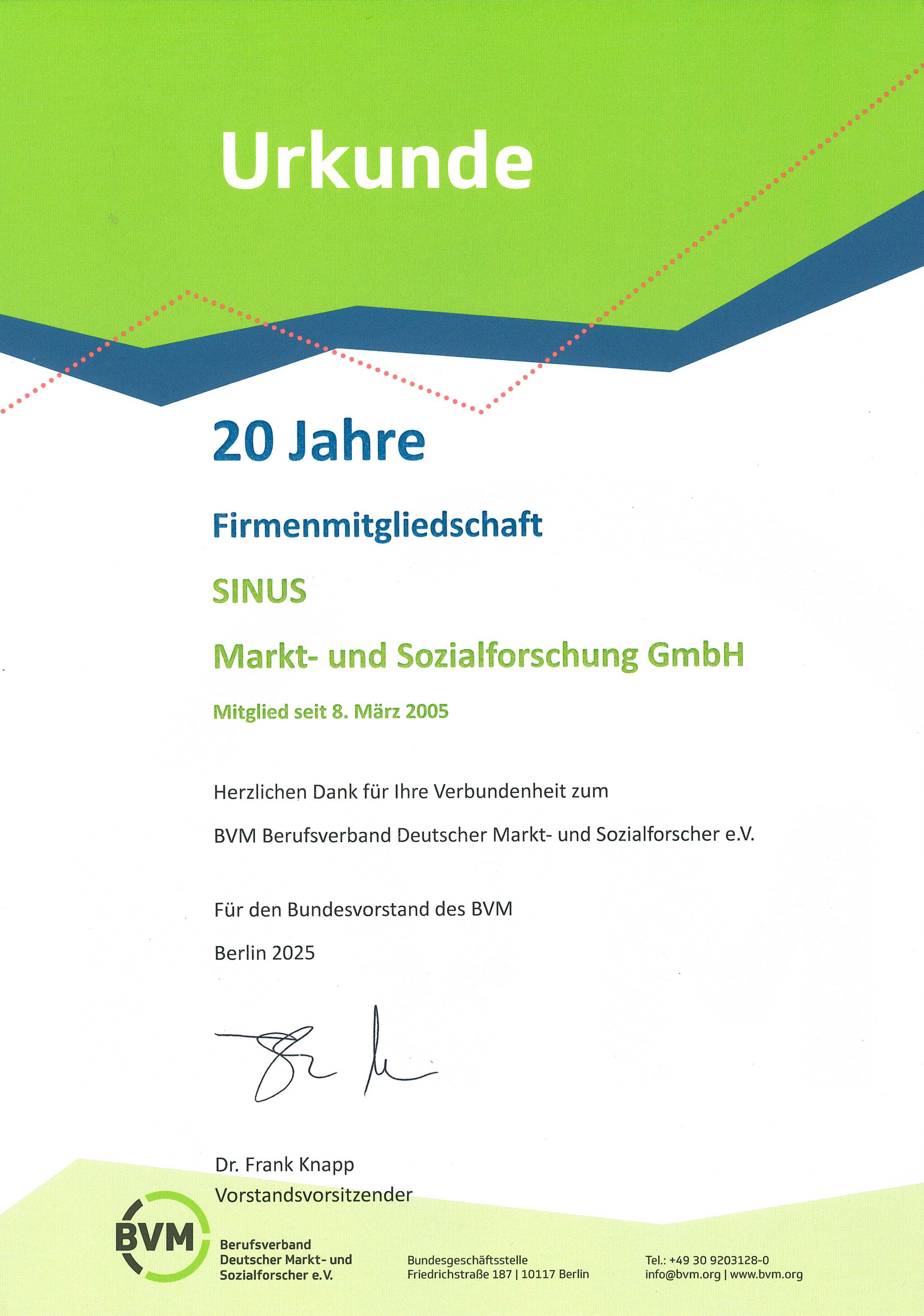 Seit zwei Jahrzehnten sind wir Teil dieses starken Netzwerks, das sich der Förderung und Professionalisierung von Markt- und Sozialforschung verschrieben hat. Für diese langjährige Zusammenarbeit hat uns der BVM mit einer Ehrenurkunde ausgezeichnet – eine Anerkennung, über die wir uns sehr freuen.