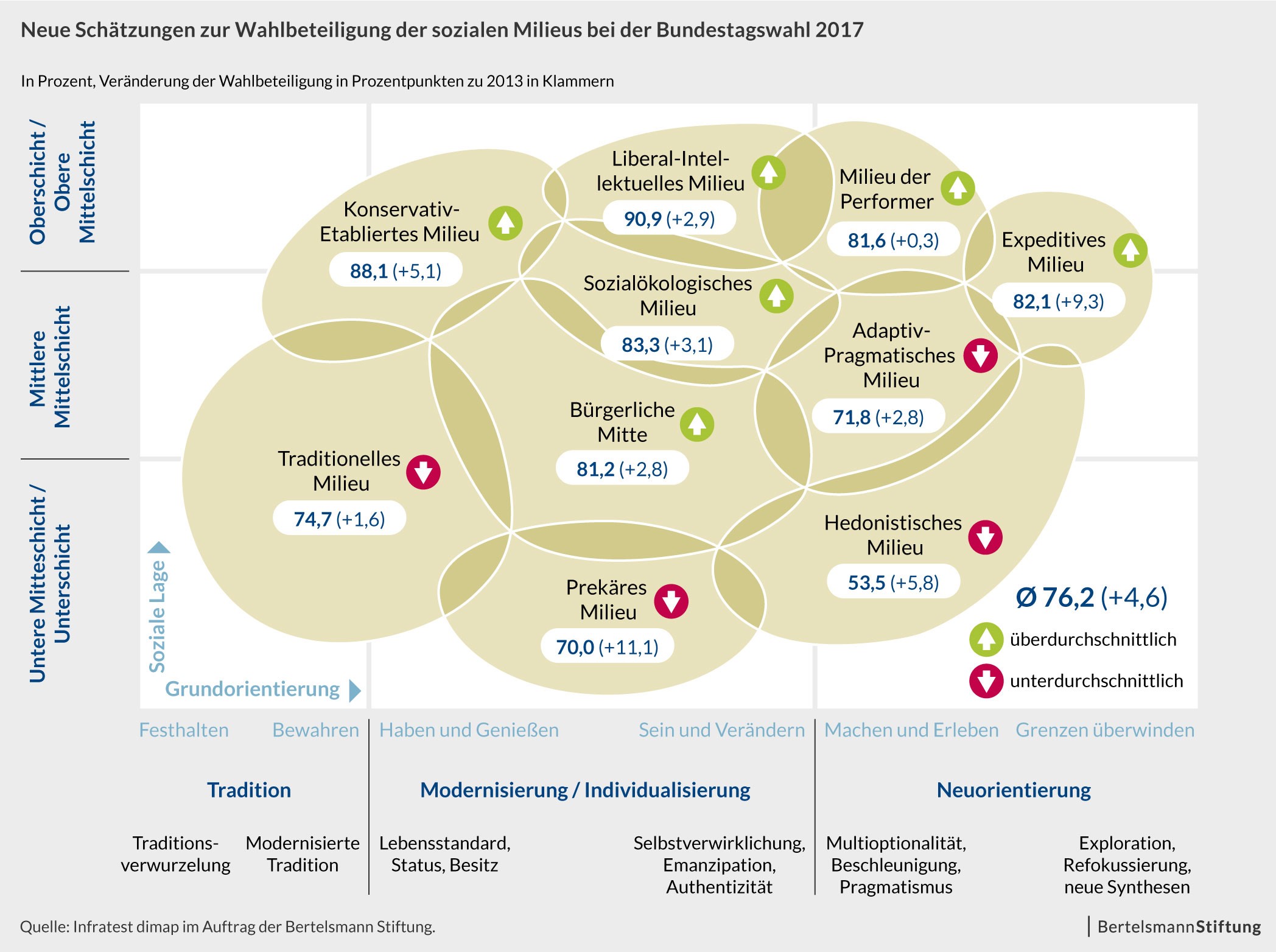 Das sozial am stärksten benachteiligte Milieu der Prekären gilt als typisches Nichtwählermilieu. So lag die Wahlbeteiligung dieses Milieus bei der Wahl 2017 unter dem Durchschnitt, aber nicht mehr so deutlich wie bei der Wahl 2013. Die Autoren erläutert die Hintergründe: „Grund dafür war vor allem das Wahlergebnis der AfD, deren rechtspopulistische Mobilisierungsstrategien in den Nichtwählermilieus besonders erfolgreich waren. Was die demokratischen Parteien nicht geschafft haben, ist der AfD bei der Bundestagswahl 2017 gelungen: Durch (Re-)Mobilisierungserfolge in den sozial prekären Nichtwählermilieus die soziale Spaltung der Wahlbeteiligung zu verringern.“
