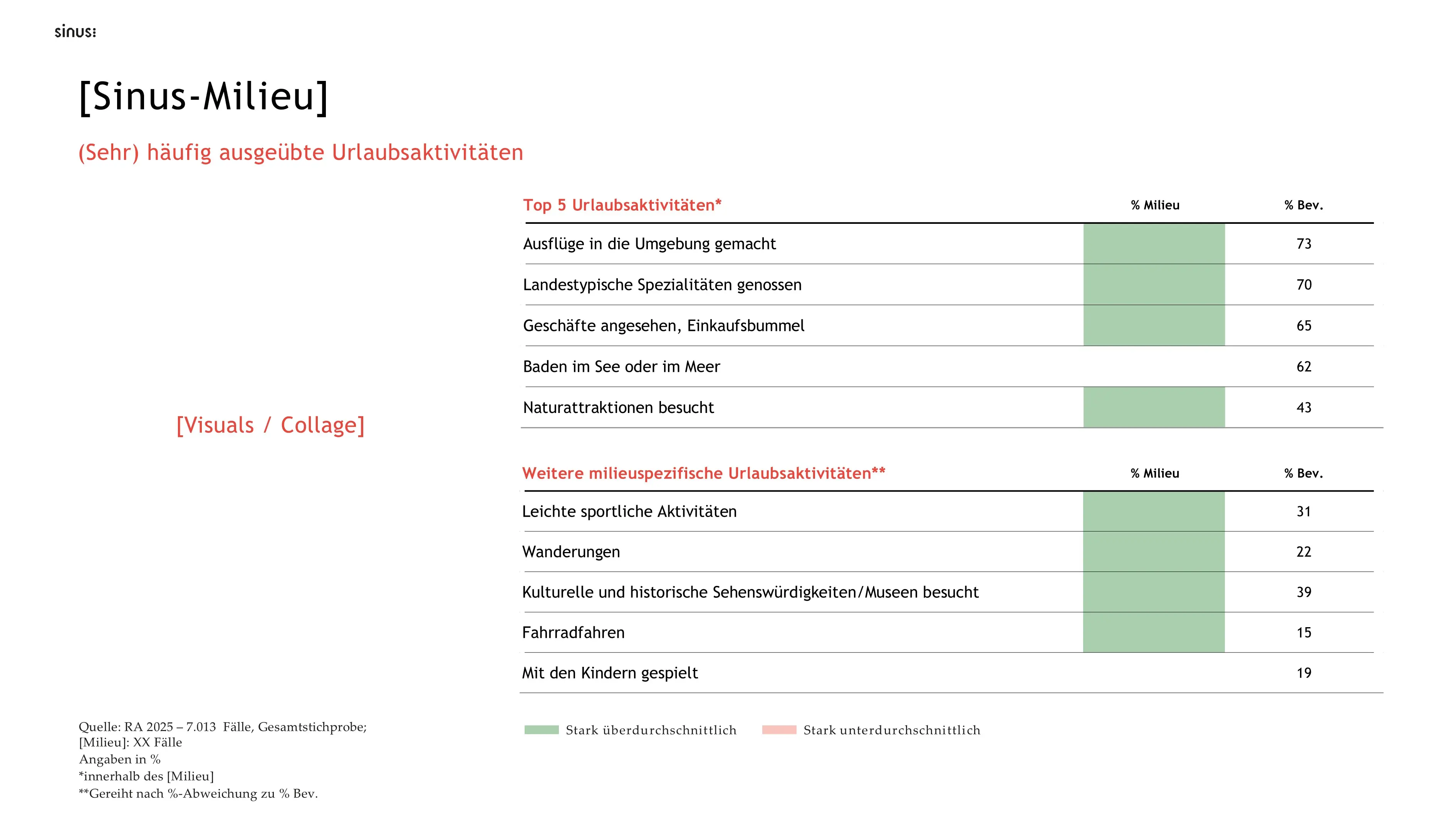 - Erstmals enthält das Infopaket milieuspezifische qualitative Texte, die das Reiseverhalten und die Vorlieben der einzelnen Sinus-Milieus anschaulich beschreiben. Welche Erwartungen haben die Milieus an ihren Urlaub? Welche Motive stehen im Vordergrund – Erholung, Erlebnis, Bildung, Gemeinschaft? Und was bedeutet Reisen jeweils im Alltag, im Lebensstil, in der Lebensphase?