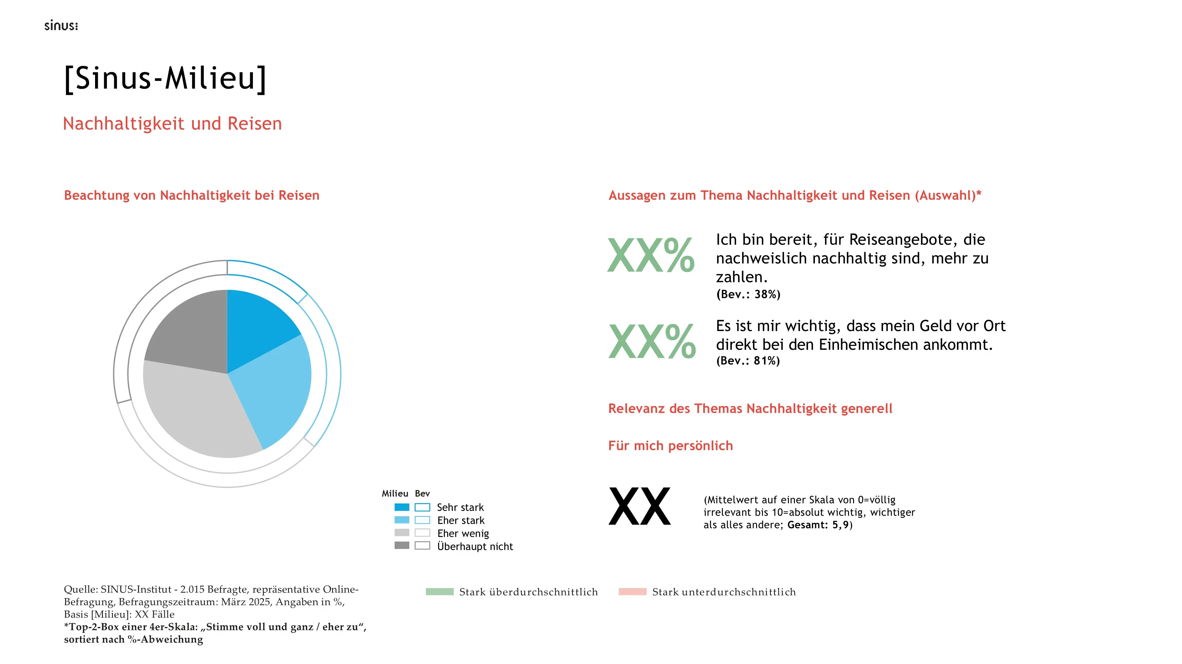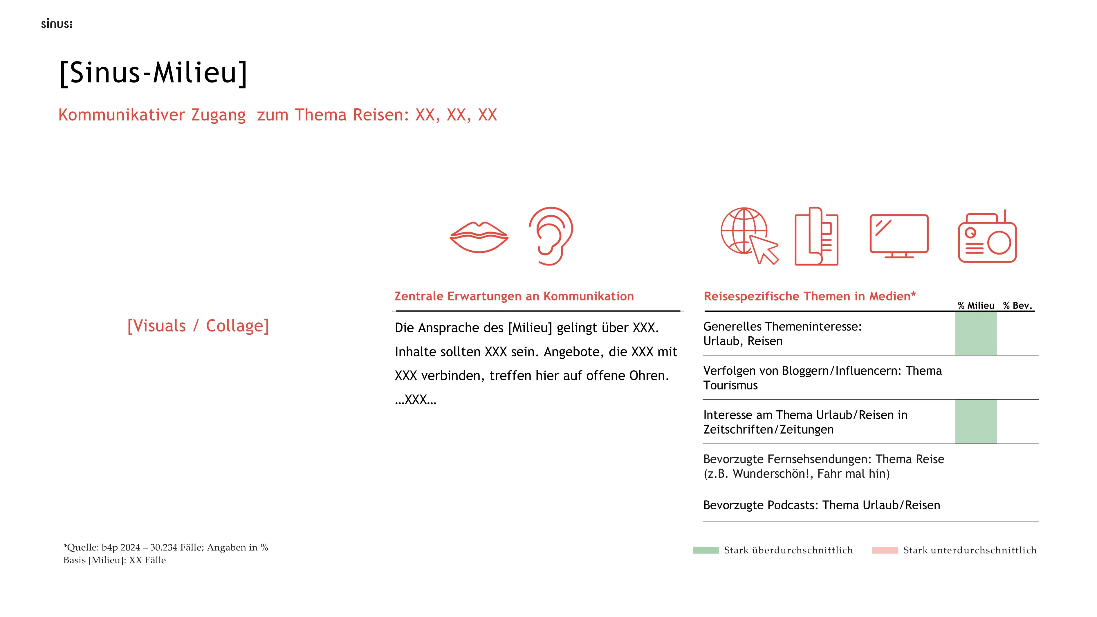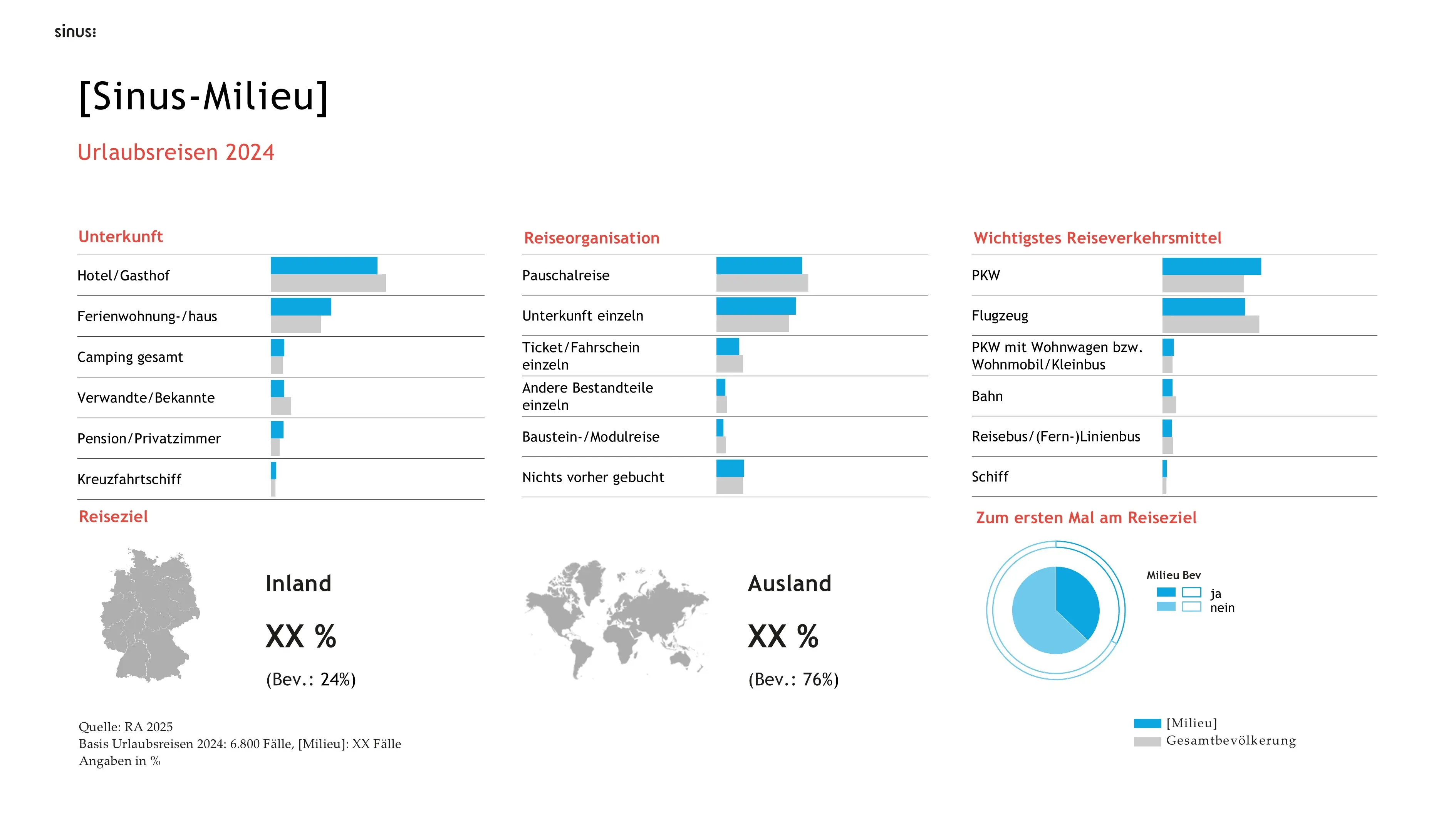 Das Infopaket „Reisen“ greift auf repräsentative Umfrage-Daten zurück, wie der jährlichen Studie ReiseAnalyse. Weitere Daten stammen – bei allen unseren Infopaketen zu den Sinus-Milieus Deutschland – aus der Markt-Media-Studie best4planning 2024 II (über 30.000 Interviews) und Eigenforschungen des SINUS-Instituts (Online-Befragungen mit 2.000 Interviews).