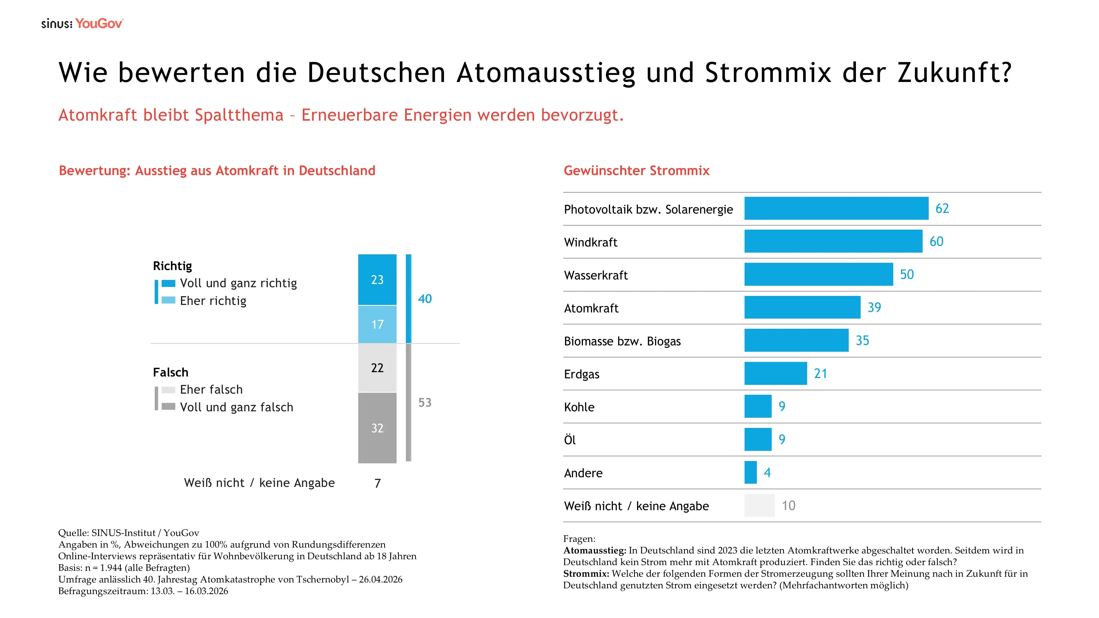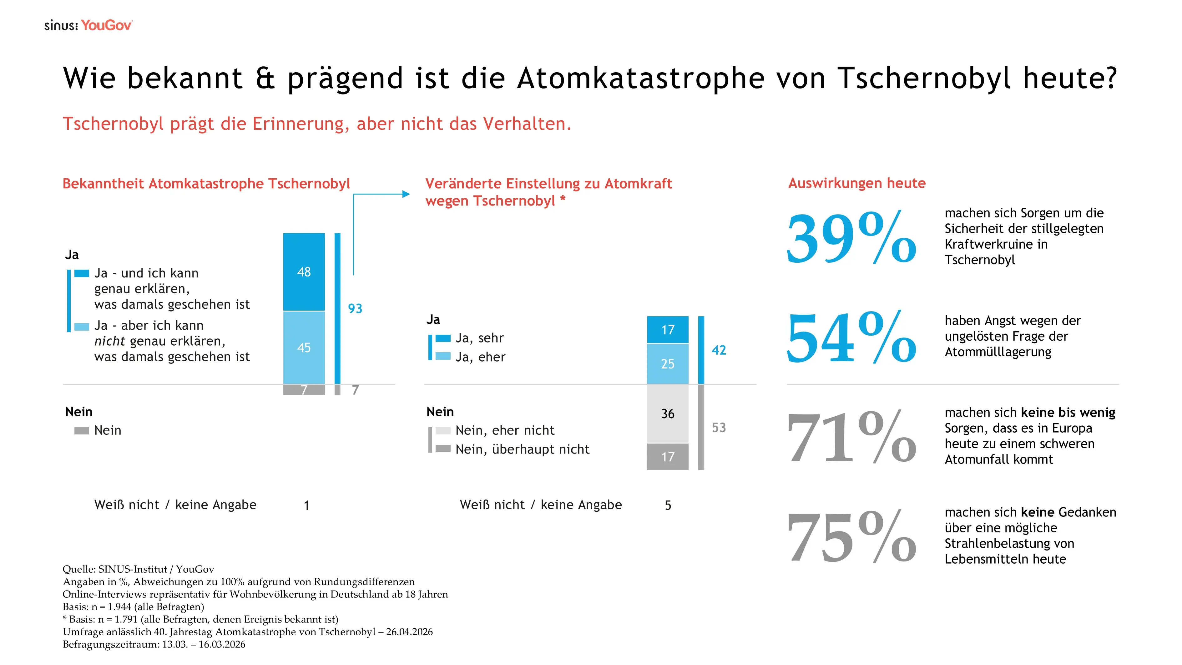 Steigende Energiepreise und Angriffe auf kritische Infrastruktur haben die Atomkraftfrage wieder stärker ins Zentrum gerückt. Eine nukleare Gefahr wird nur von wenigen Menschen wahrgenommen, konkrete Vorsorgemaßnahmen gibt es kaum. Dabei erinnern sich viele an den Super-GAU, der den Alltag schlagartig veränderte: der Reaktorunfall von Tschernobyl am 26. April 1986. Die Katastrophe war ein Moment massiver Verunsicherung, der das Leben von einem Tag auf den anderen veränderte. Vier Jahrzehnte später ist das Ereignis weiterhin tief im kollektiven Gedächtnis verankert. Gleichzeitig zeigt sich ein deutlicher Widerspruch zwischen historischer Erfahrung, aktueller Einschätzung und persönlicher Notfallvorsorge. Eine repräsentative Online-Befragung von SINUS-Institut und YouGov zum Jahrestag der Katastrophe hat die Stimmungslage in Deutschland untersucht.