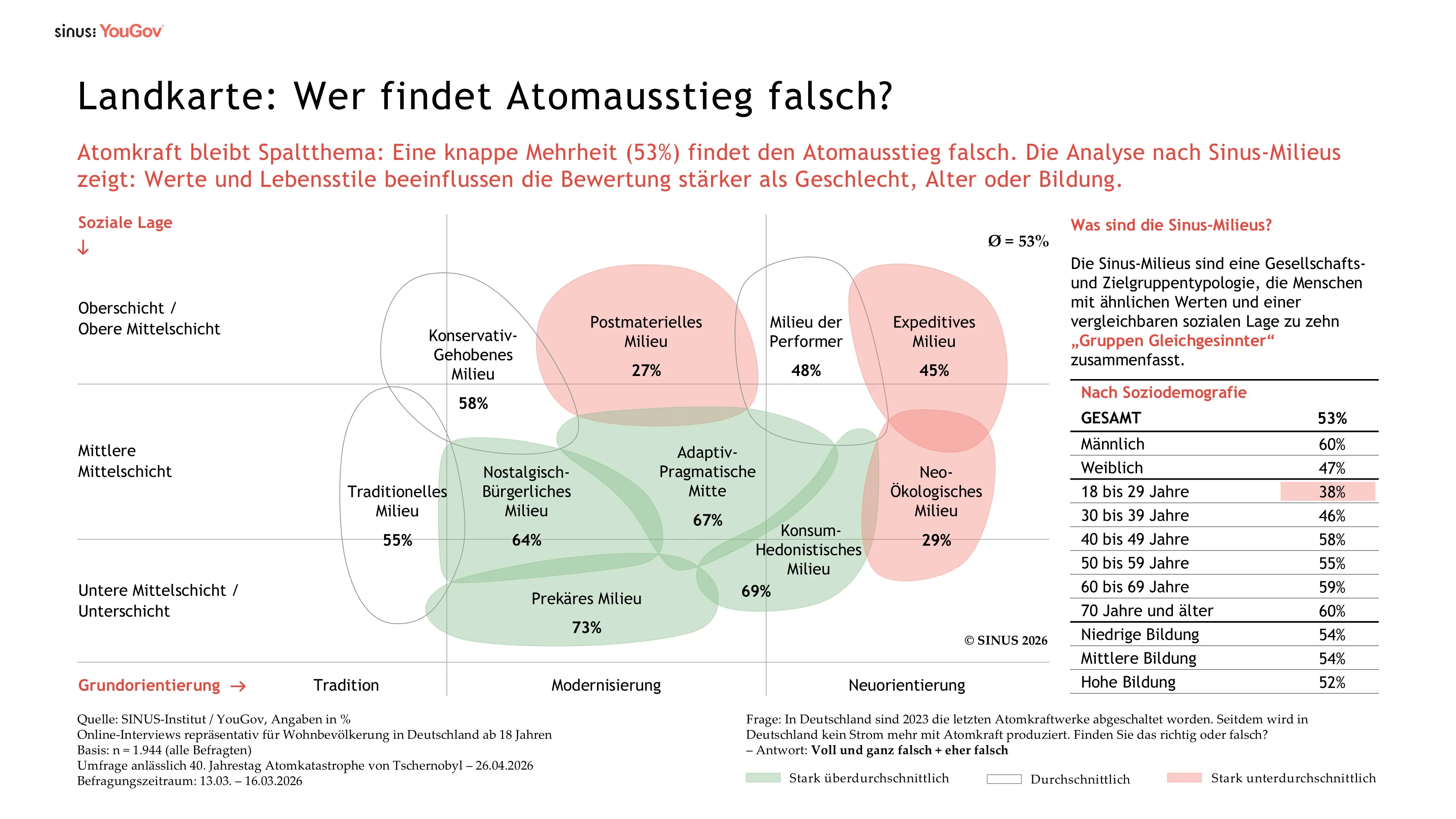 Die Haltung gegenüber Atomkraft ist stark von den grundlegenden Lebenseinstellungen geprägt. Ein Blick auf die Sinus-Milieus verdeutlicht diesen Einfluss. In diesem Modell, das Menschen nach ihren Werten und Lebensstilen in „Gruppen Gleichgesinnter” zusammenfasst, lassen sich Milieus identifizieren, die Atomkraft besonders kritisch gegenüberstehen – und auch solche, die einen pragmatischen Zugang zur Nuklearenergie haben. Das verantwortungsbewusste Postmaterielle Milieu und das veränderungswillige Neo-Ökologische Milieu eint die Sorge um die Auswirkungen der Atomkraft. Sie lehnen diese Art der Energiegewinnung entsprechend klar ab. Dagegen bedauern die beiden Mitte-Milieus – die nutzenfokussierte Adaptiv-Pragmatische Mitte und das stabilitätsorientierte Nostalgisch-Bürgerliche Milieu - den Atomausstieg in Deutschland. „In den Mitte-Milieus wird Atomkraft nicht primär als Risiko, sondern als funktionale Option im Spannungsfeld von Versorgungssicherheit, Kosten und Klimazielen gesehen.“, so SINUS-Geschäftsführerin Dr. Silke Borgstedt.