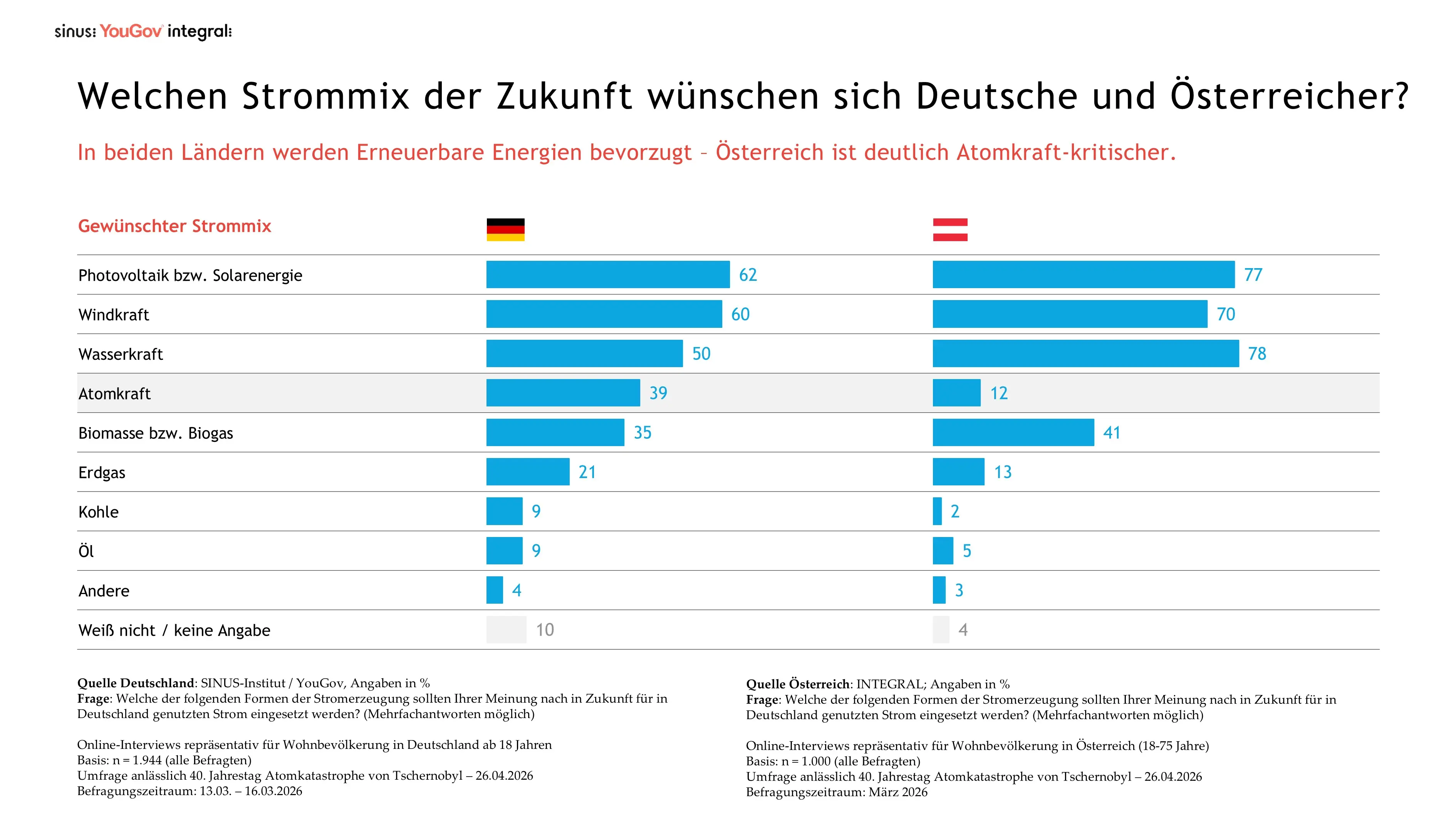 Im Vergleich mit Österreich wird schnell deutlich, dass unser Nachbarland schon immer auf Atomkraft verzichtet – und aus meteorologischer und geographischer Perspektive bei der Katastrophe von Tschernobyl stärker betroffen war. Das hat das SINUS-Schwesterinstitut INTEGRAL für Österreich herausgefunden. So ist die Ablehnung der Atomkraft dort deutlich stärker ausgeprägt als hierzulande: 76% finden es richtig, dass Österreich auf Atomkraftwerke verzichtet (vs. 40% in Deutschland), für die Stromerzeugung wünschen sich 12% Atomkraft (vs. 39%). Zudem sind die Anteile jener, die Atomkraft mit Blick auf Klimaschutz, Kostenersparnis oder Versorgungssicherheit befürworten, nur halb so hoch wie in Deutschland.
