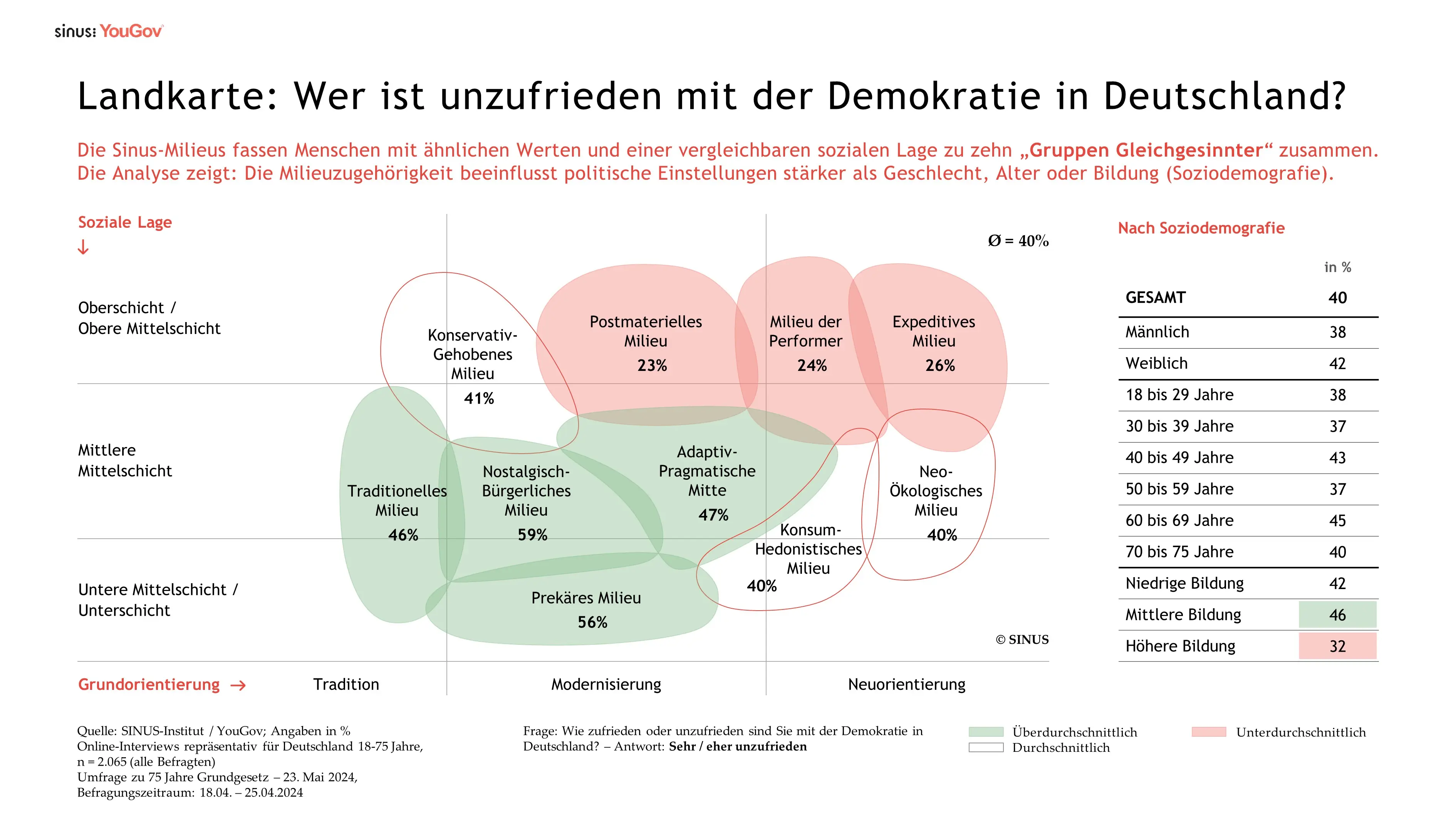 Auch in einem weiteren Milieu der Mitte ist die Demokratieverdrossenheit überdurchschnittlich groß: 47% der Adaptiv-Pragmatischen sind unzufrieden. Dazu Dr. Borgstedt: „Dieser moderne, leistungsorientierte Teil der Mitte ist in der Rushhour seines Lebens und zunehmend frustriert von schlechter Infrastruktur und nicht eingelösten Transformationsversprechen. Beide Mitte-Milieus eint der Wunsch nach Planbarkeit und Wohlstandssicherheit und der Eindruck von Staat & Politik nicht wahrgenommen zu werden.“