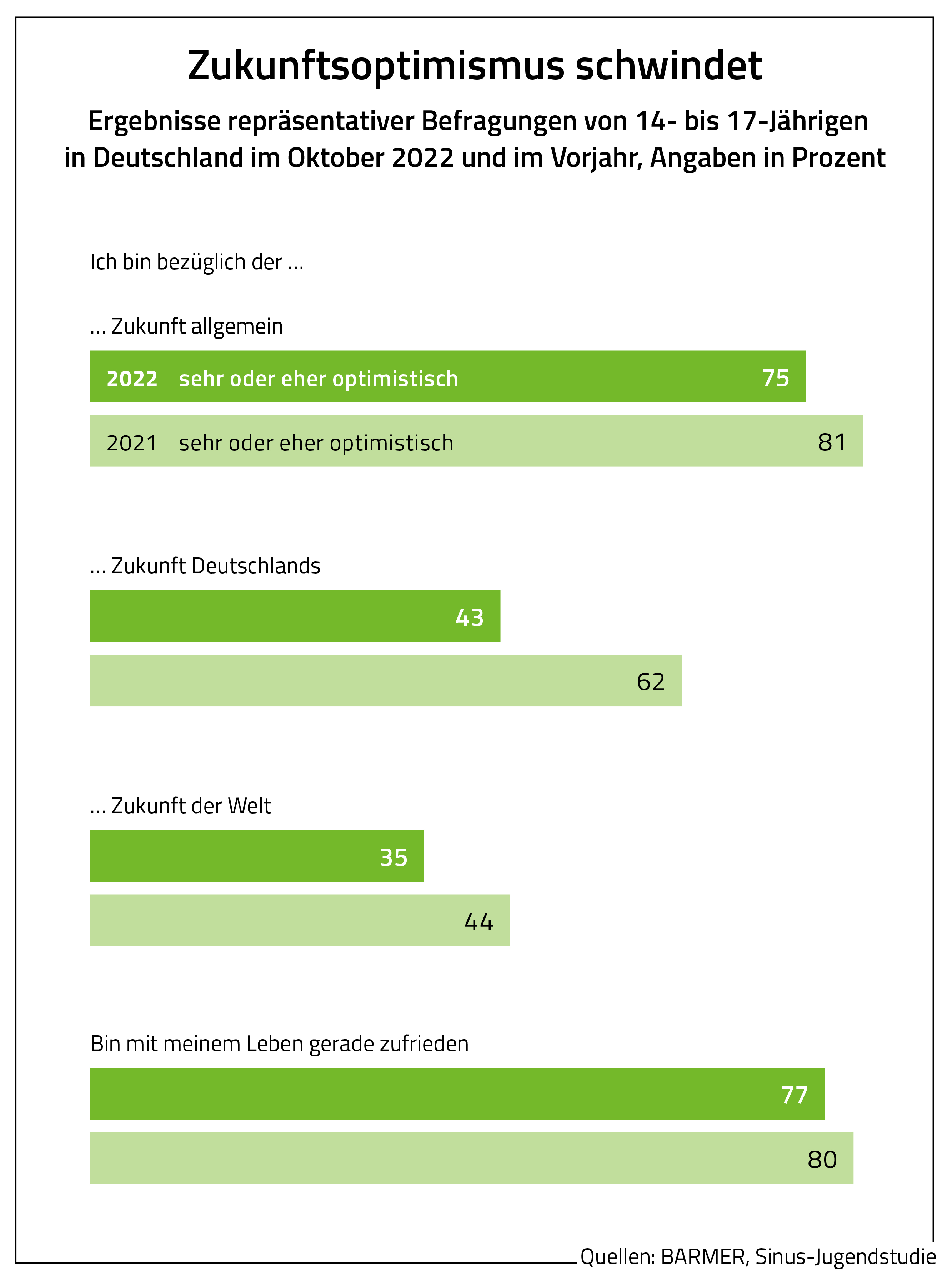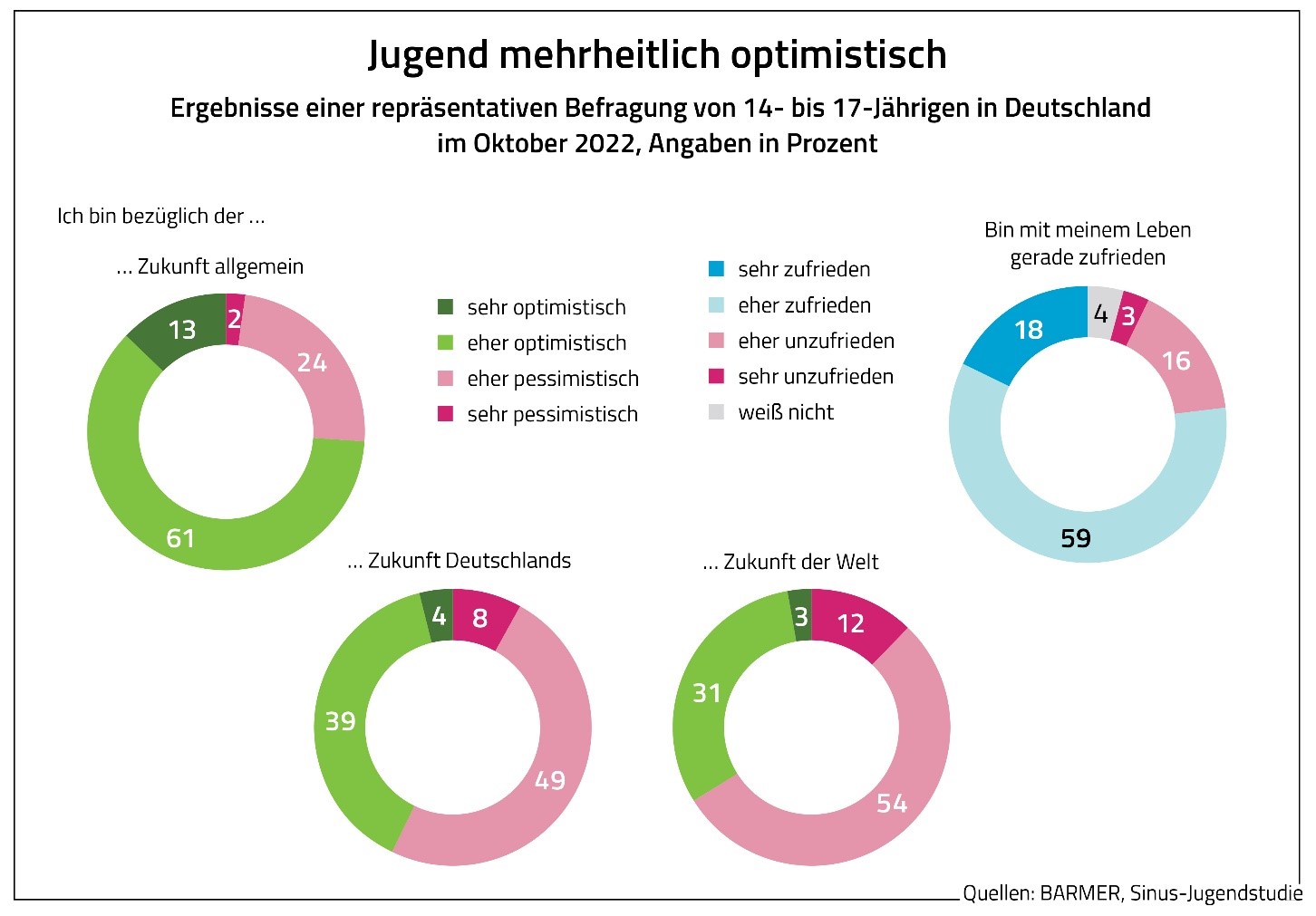 Die Stimmung unter Deutschlands Jugendlichen trübt sich ein. Sowohl die persönliche Zukunft als auch die Aussichten des Landes werden pessimistischer eingeschätzt als noch ein Jahr zuvor. Dennoch bleibt die Mehrheit optimistisch. Das geht aus der repräsentativen Sinus-Jugendstudie im Auftrag der BARMER hervor, für die im Oktober 2022 bundesweit 2.001 Jugendliche zwischen 14 und 17 Jahren befragt worden waren. So sank der Anteil derer, die sehr oder eher optimistisch auf ihre Zukunft schauen, auf 75 Prozent, sechs Prozentpunkte weniger als ein Jahr zuvor. Nur 43 Prozent sehen Deutschlands Zukunft optimistisch, ein Jahr zuvor waren es noch 62 Prozent. „Optimismus sollte ein Wesenszug der Jugend sein. Darum sollte es uns aufmerksam machen, wenn sich innerhalb eines Jahres junge Menschen deutlich mehr um ihre Zukunft und die unseres Landes sorgen“, sagt Prof. Dr. med. Christoph Straub, Vorstandsvorsitzender der BARMER. Im Gegensatz zum schwindenden Optimismus der Jugend sei die Zufriedenheit mit dem eigenen Leben mit 77 Prozent im Jahr 2022 gegenüber 80 Prozent im Jahr zuvor kaum gesunken.