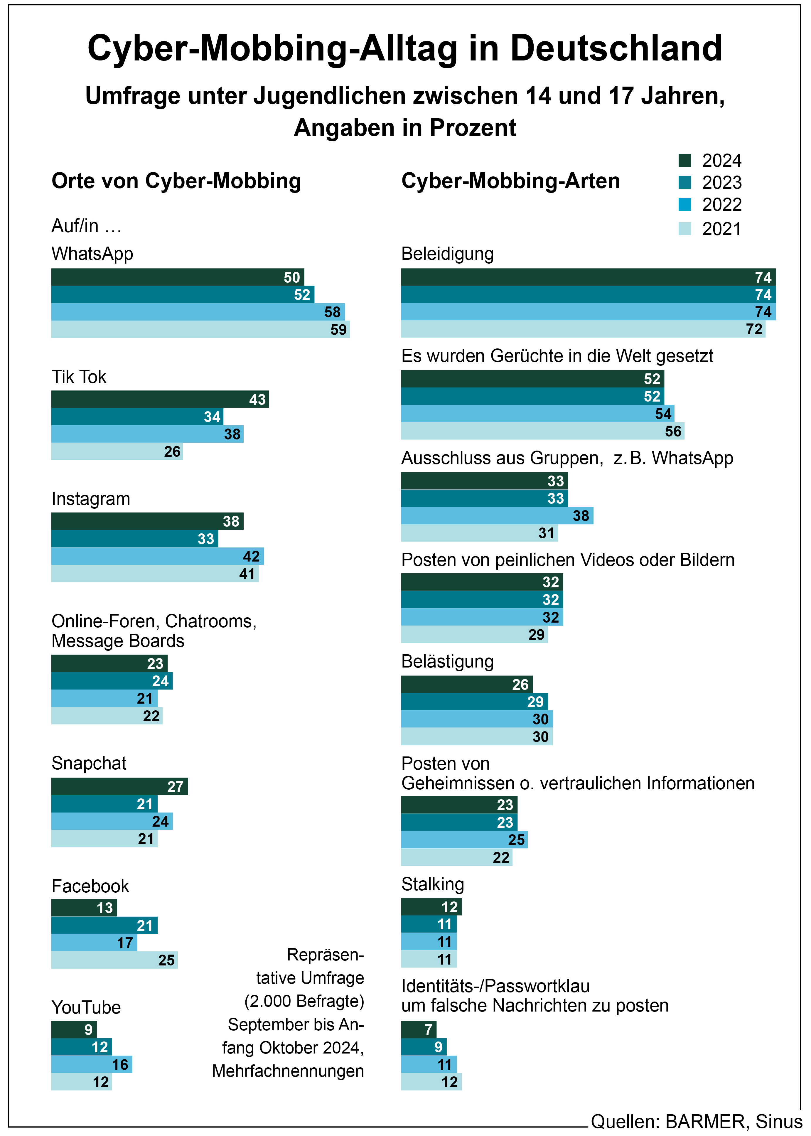 Besonders alarmierend sei ein Teilergebnis der Sinus-Jugendstudie, nach dem 25 Prozent der Betroffenen keinerlei Unterstützung bei Cyber-Mobbing-Attacken erhalten haben sollen. Dieser Wert lag im Jahr 2023 mit 15 Prozent, in 2022 mit 19 Prozent und 2021 mit 16 Prozent noch deutlich niedriger und kann damit als dramatische Verschlechterung bewertet werden.