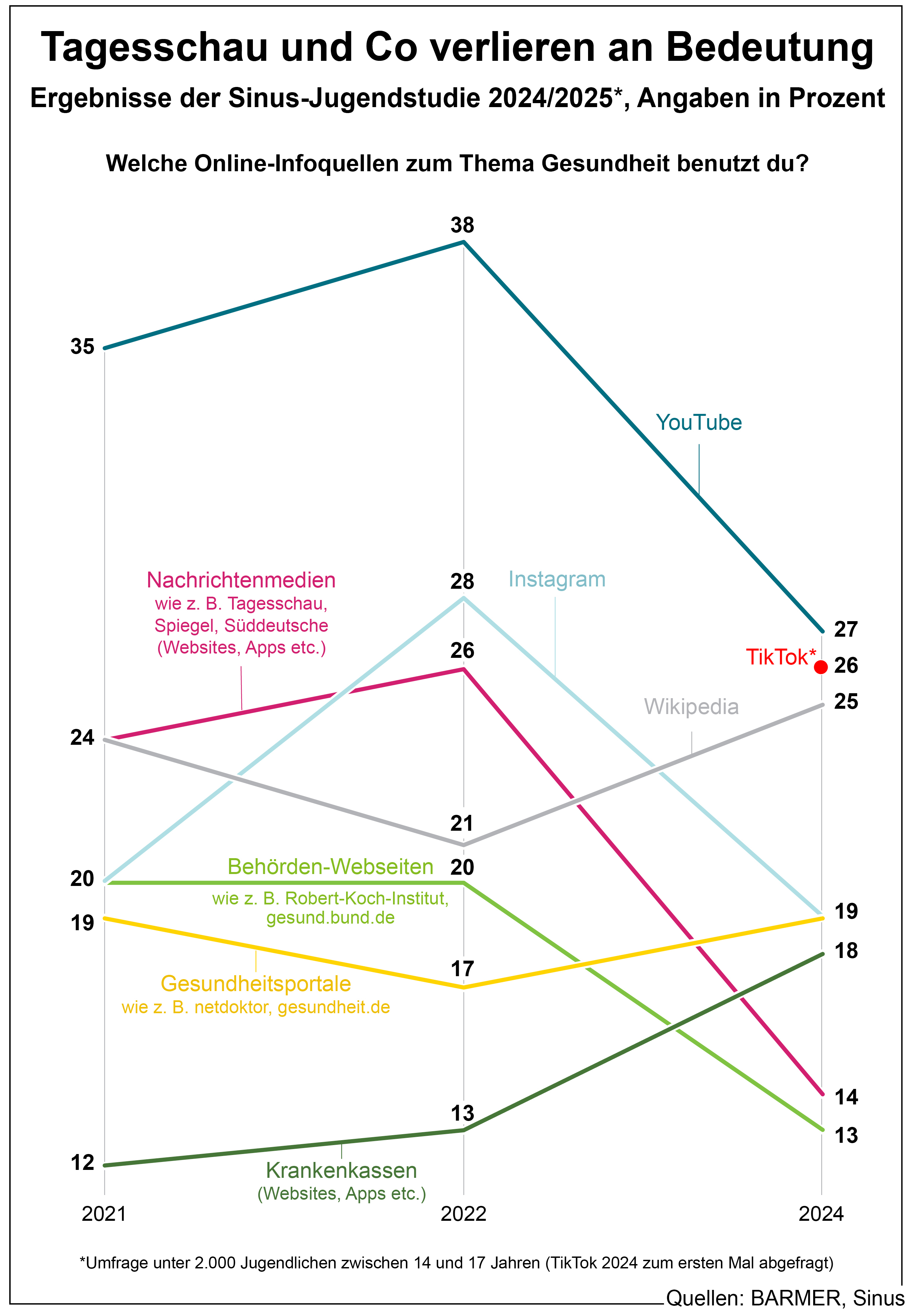 Junge Menschen in Deutschland beziehen ihre Gesundheitsinformationen vor allem über Youtube, TikTok und Wikipedia. Das geht aus der repräsentativen Sinus-Jugendstudie 2024/2025 im Auftrag der BARMER hervor, für die im Herbst 2024 bundesweit rund 2.000 Jugendliche zwischen 14 und 17 Jahren befragt wurden. Demnach nutzten 27 Prozent von ihnen Youtube, 26 Prozent TikTok und 25 Prozent Wikipedia als Online-Infoquellen für Gesundheitsthemen. „Junge Menschen nutzen für die Gesundheits-Recherche häufig digitale Quellen mit möglicherweise zweifelhaftem Inhalt. Um beurteilen zu können, welche Informationen auf wissenschaftlichen Fakten beruhen, ist eine Stärkung der digitalen Gesundheitskompetenz unerlässlich“, sagt Prof. Dr. med. Christoph Straub, Vorstandsvorsitzender der BARMER. Vor diesem Hintergrund biete die BARMER das Präventionsprojekt DURCHBLICKT! für Schülerinnen und Schüler, Lehrkräfte und für Eltern an. Es stelle unter anderem lehrplankonformes Material zu Digitalthemen für den Unterricht bereit.