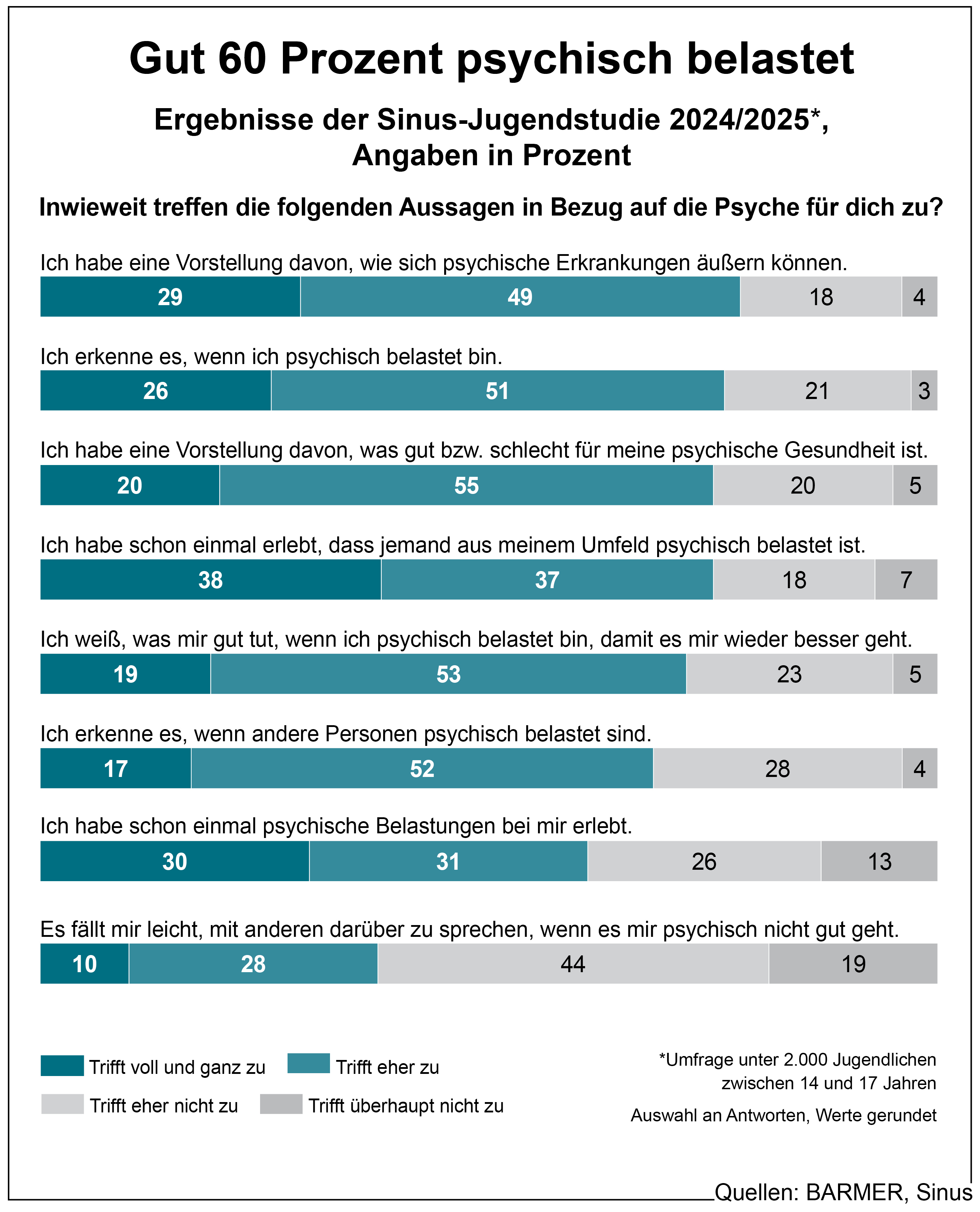Knapp 80 Prozent der Jugendlichen in Deutschland haben eine Vorstellung davon, wie sich psychische Erkrankungen äußern können. 72 Prozent haben Kenntnis, was ihnen bei psychischen Belastungen helfen könnte. Das geht aus der repräsentativen Sinus-Jugendstudie 2024/2025 im Auftrag der BARMER hervor. Dafür wurden von September bis Anfang Oktober 2024 bundesweit 2.000 Mädchen und Jungen im Alter zwischen 14 und 17 Jahren befragt. Demnach sind Mädchen und Jungen aus höhergebildeten Gruppen (74 Prozent) besser informiert als Jugendliche aus bildungsferneren Lebenswelten (63 Prozent). „Das Bewusstsein für mentale Gesundheit scheint unter jungen Menschen ausgeprägt zu sein. Das ist erfreulich! Gleichzeitig zeigen sich erhebliche Wissenslücken beim Umgang mit psychischen Belastungen. Besonders Jugendlichen aus prekären Verhältnissen fehlen wichtige Handlungsstrategien. Sie brauchen mehr Unterstützung. Hier muss Prävention gezielt ansetzen“, fordert Prof. Dr. med. Christoph Straub, Vorstandsvorsitzender der BARMER. Anlaufstellen für Hilfe bei einer psychischen Belastung seien nicht allen Jugendlichen bekannt. Das müsse sich dringend ändern.