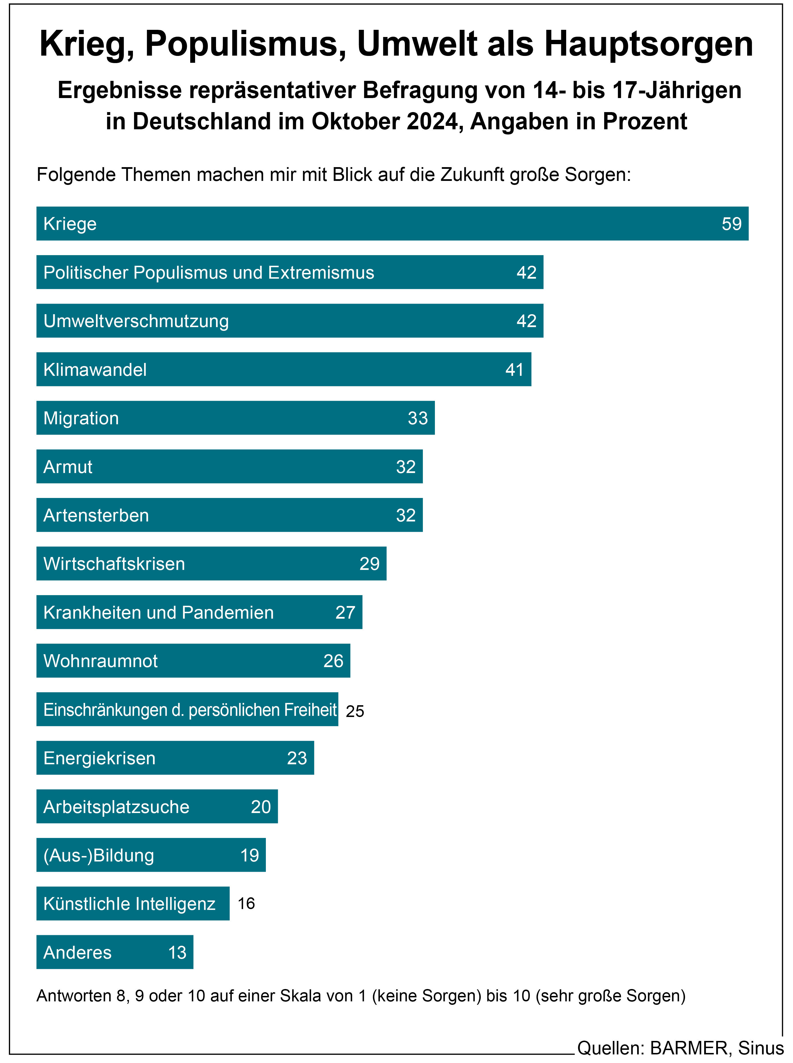 Politischer Populismus und Extremismus bereiten fast jedem zweiten Jugendlichen in Deutschland mit Blick auf die Zukunft Sorgen. Das geht aus der repräsentativen Sinus-Jugendstudie 2024 im Auftrag der BARMER hervor, für die im Herbst bundesweit 2.000 Jugendliche zwischen 14 und 17 Jahren befragt wurden. Demnach nennen 42 Prozent der Befragten Populismus und Extremismus als Grund großer persönlicher Befürchtungen. Lediglich Kriege erwähnten sie als einziges Thema mit 59 Prozent noch häufiger. Im Jahr zuvor lag dieser Anteil noch bei 53 Prozent. „Es ist ein Alarmsignal, dass so viele Teenager in diesen unruhigen Zeiten Zukunftsängste haben. Gerade die Jugend sollte möglichst unbeschwert verlaufen und frei sein von existenziellen Sorgen. Denn diese können die Psyche massiv belasten und damit letzten Endes auch die Gesundheit beeinträchtigen“, sagt Prof. Dr. med. Christoph Straub, Vorstandsvorsitzender der BARMER.