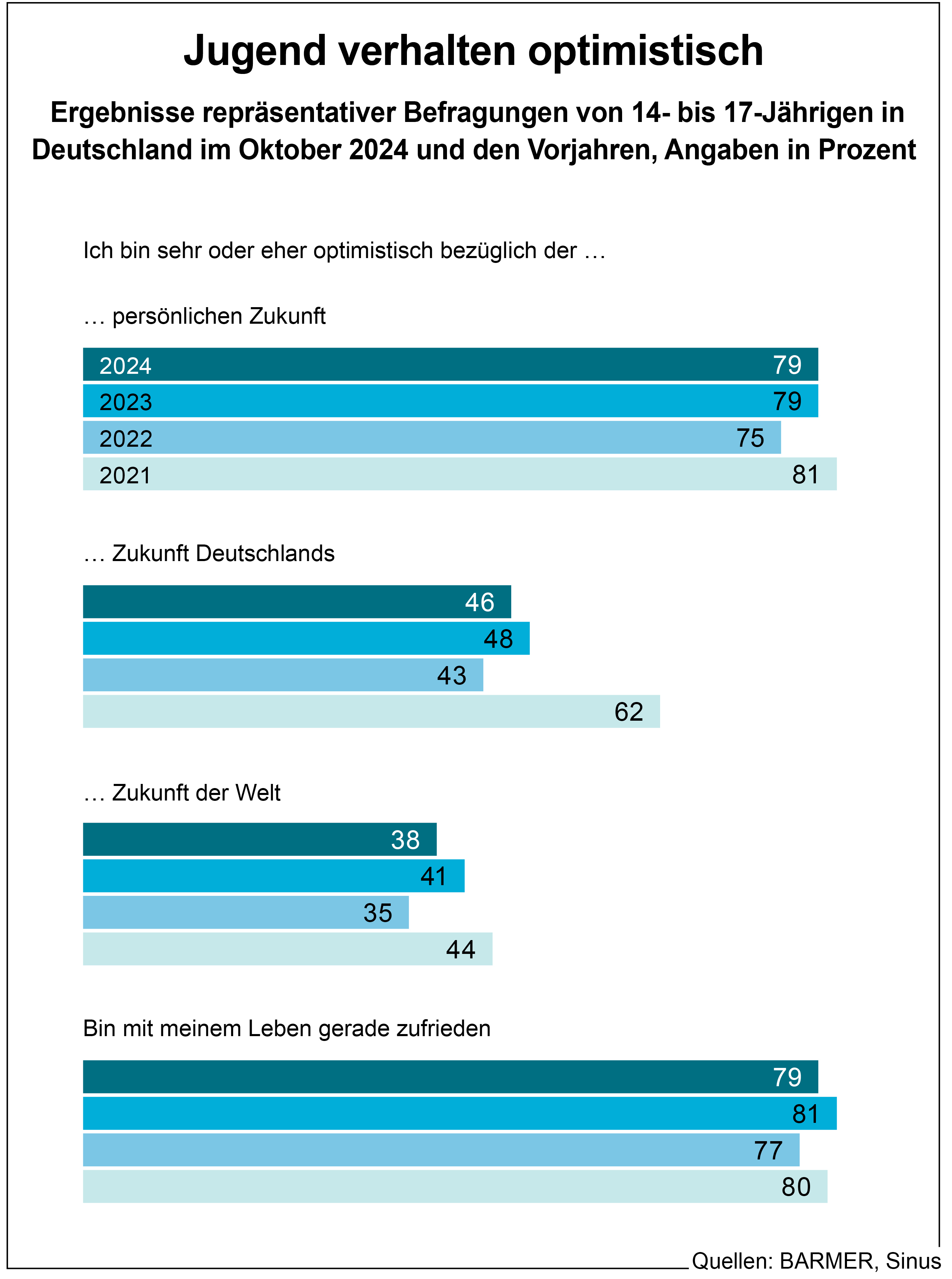 Wie aus der Sinus-Studie weiter hervorgeht, schauen die Jugendlichen hierzulande aber grundsätzlich positiv nach vorn. Demnach blicken derzeit 79 Prozent optimistisch in ihre persönliche Zukunft. Das ist derselbe Wert wie im Jahr 2023. Während der Zukunftsoptimismus bei Schülern mit einem niedrigeren Bildungsniveau von 70 auf 79 Prozent gestiegen ist, ist er bei angehenden Abiturientinnen und Abiturienten von 82 auf 79 Prozent gesunken. Derzeit sind 79 Prozent der befragten Teenager mit ihrem Leben zufrieden und damit zwei Prozentpunkte weniger als im Jahr 2023.