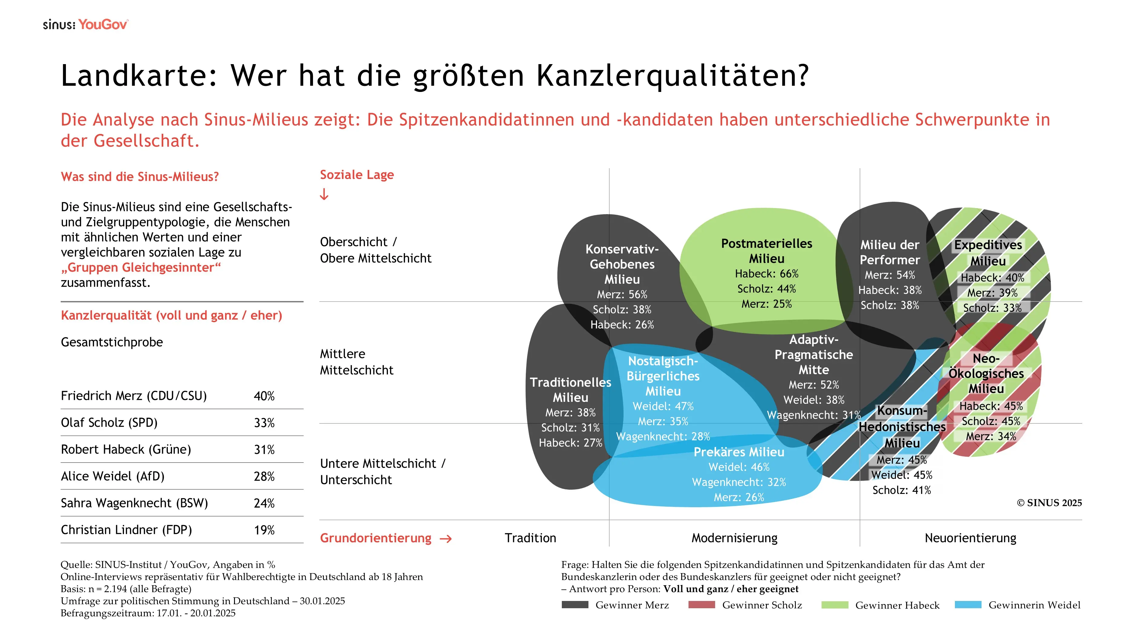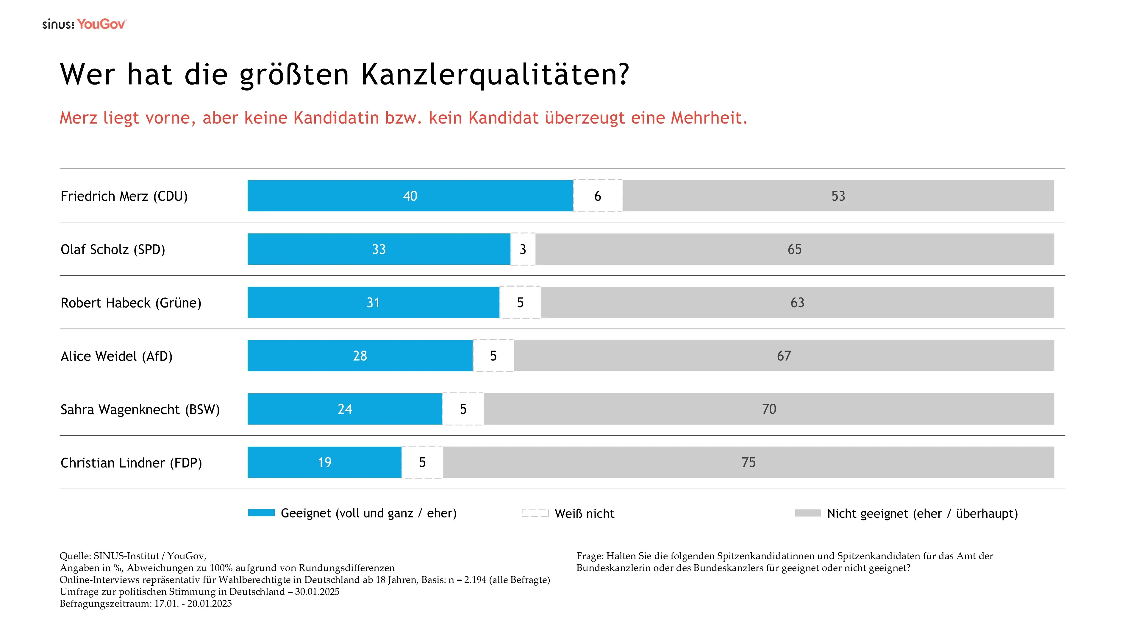 -kandidaten eine breite Mehrheit der Wahlberechtigten überzeugt. Auf die Frage, ob sie die einzelnen Bewerberinnen und Bewerber für das Amt der Bundeskanzlerin bzw. des Bundeskanzlers geeignet („voll und ganz“ oder „eher“) halten, bekommt die höchste Zuschreibung erneut Friedrich Merz (CDU) mit 40%. Olaf Scholz (SPD) folgt mit 33%, dicht dahinter Robert Habeck (Grüne) mit 31%. Alice Weidel erreicht 28%, Sahra Wagenknecht kommt auf 24% und Christian Lindner auf 19%.