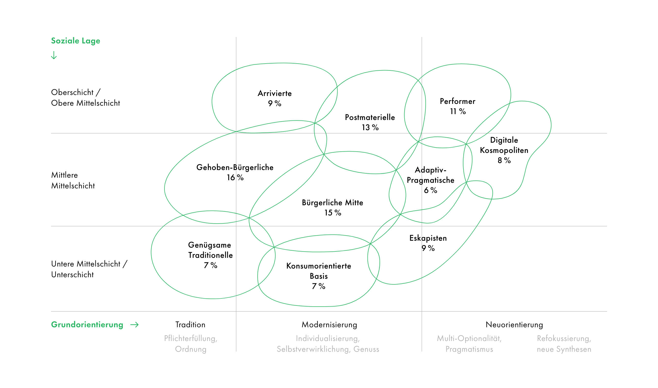 In der vertikalen Achse ist jeweils die soziale Lage (sie reicht von niedrig bis hoch) dargestellt und in der horizontalen Achse die Wertorientierung (sie reicht von traditionell bis postmodern). Je höher ein Milieu in dieser Grafik angesiedelt ist, desto gehobener sind Bildung, Einkommen und Berufsgruppe; je weiter nach rechts es sich erstreckt, desto moderner im soziokulturellen Sinn ist die Grundorientierung des jeweiligen Milieus.