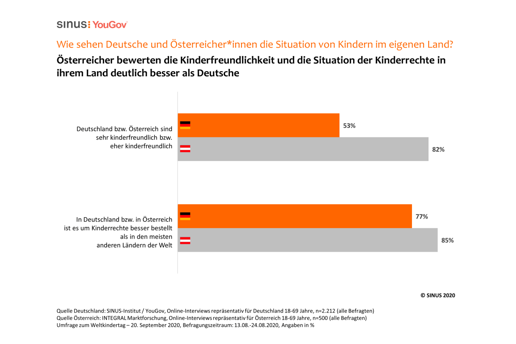 Eine parallel durch den SINUS-Partner INTEGRAL Marktforschung durchgeführte Studie in Österreich zeigt: 82% unserer Nachbarn stufen ihr Land als kinderfreundlich ein, während dies nur 53% der Deutschen für ihr Land so sehen. Auch die Rechte der Kinder werden bei unseren Nachbarn besser bewertet als hierzulande: 85% der Österreicher sind der Ansicht, dass es bei ihnen um Kinderrechte besser bestellt ist als in den meisten anderen Ländern, während 77% der Deutschen dies für die Situation in Deutschland bekunden. Diese Länderunterschiede können darauf zurückzuführen sein, dass Kinderrechte in Österreich – im Gegensatz zu Deutschland – bereits in der Verfassung verankert sind.