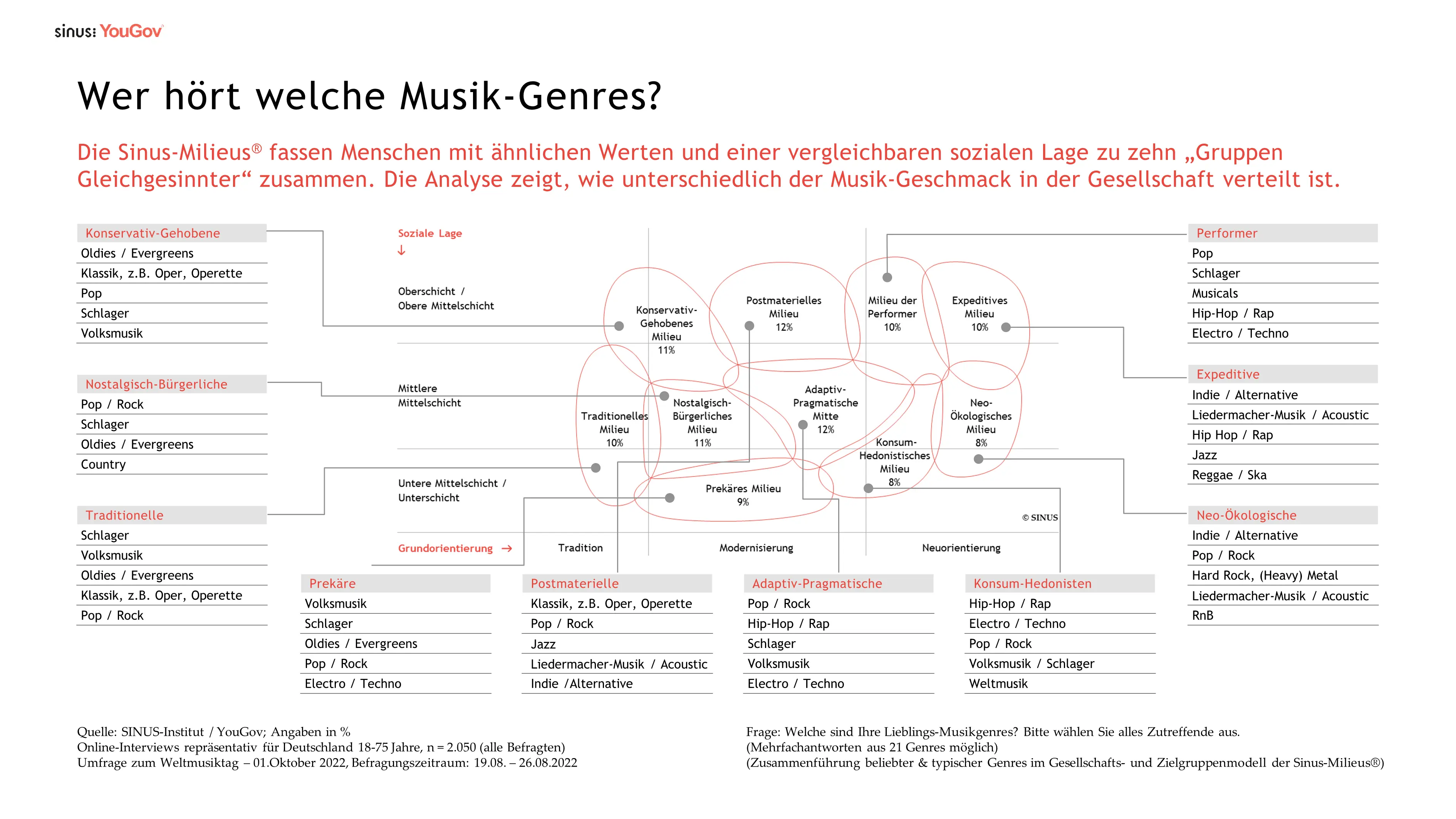 Dr. Silke Borgstedt, Geschäftsführerin des SINUS-Instituts, erläutert: „Schauen wir uns beispielsweise das Konservativ-Gehobene Milieu an, das ist die etablierte Elite unserer Gesellschaft. Hier hört man typischerweise klassische Musik, aber auch Schlager mit Niveau. Ganz andere Musik hört die ambitionierte kreative Bohème unseres Landes, das Expeditive Milieu. Dieser Gruppe gefällt Indie / Alternative, Acoustic oder Jazz überdurchschnittlich gut – sowie generell alles, was unter dem Mainstream-Radar läuft. Fans von Electro / EDM / Techno und Hip-Hop / Rap findet man besonders häufig im Konsum-Hedonistischen Milieu, der auf Entertainment und Nachtaktivitäten fokussierten unteren Mitte.“ Mehr Informationen zu diesen gesellschaftlichen Gruppen finden sich auf der Webseite des SINUS-Instituts.