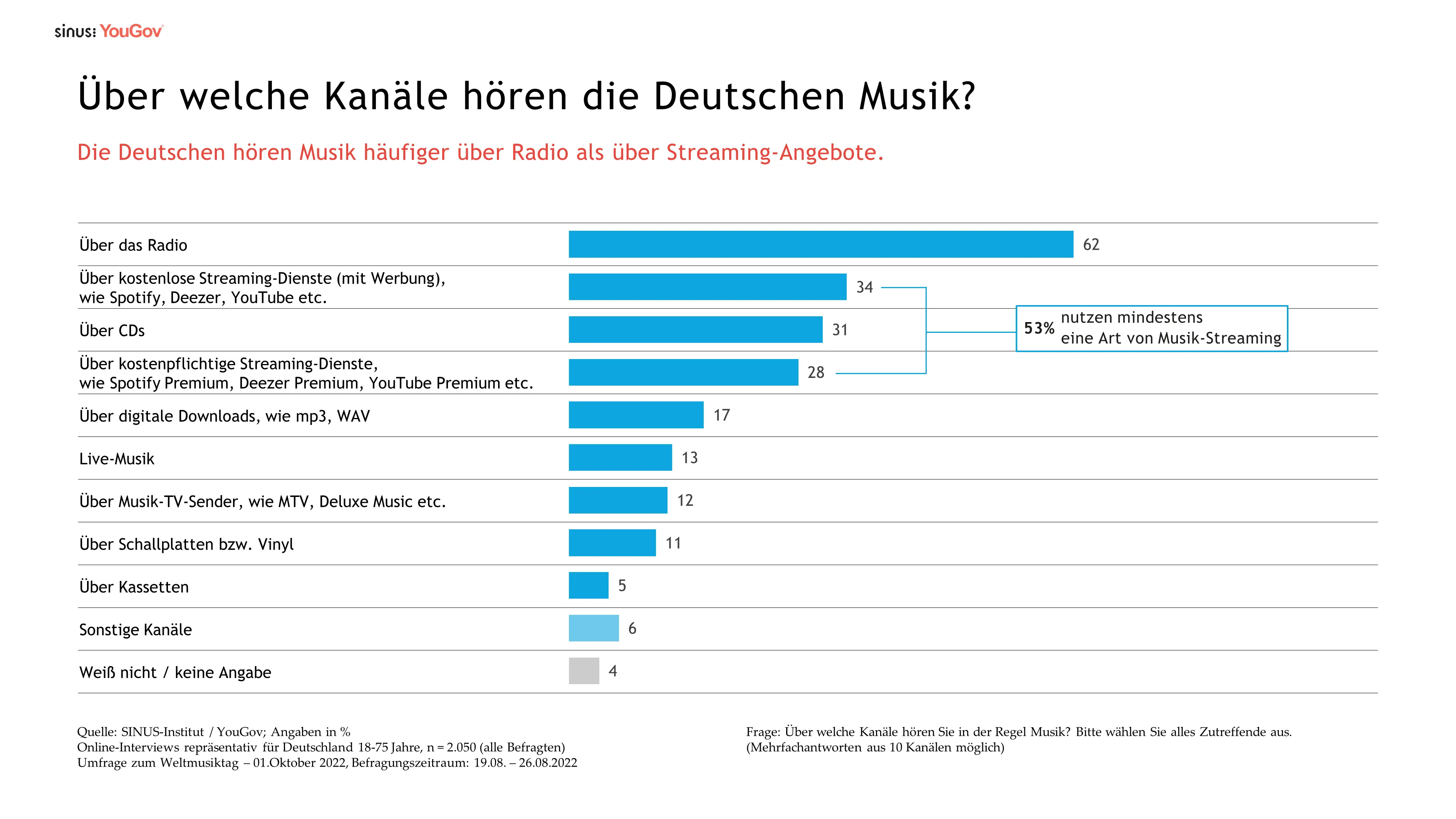 Die Frage nach den favorisierten Musik-Kanälen anhand einer Mehrfachauswahl ergibt, dass Streaming-Dienste dem Radio mit etwas Abstand folgen. Insgesamt 53 % der Deutschen nutzen mindestens eine Art von Musik-Streaming. Dabei geben 34 % an, kostenlose Dienste mit Werbung zu hören, und 28 % genießen Musik von kostenpflichtigen Anbietern ohne Werbung. Erwartungsgemäß sind es demnach auch die Jüngeren, die ihre Musik am häufigsten über Spotify, Deezer, YouTube und Co. hören. Dabei werden von 18- bis 29-Jährigen kostenpflichtige Dienste (51 %) häufiger genutzt als kostenlose Angebote (42 %). Die klassische CD verwenden noch 31 % aller Befragten für ihren Musikkonsum, insbesondere die Altersgruppe der 60- bis 75-Jährigen (45 %).