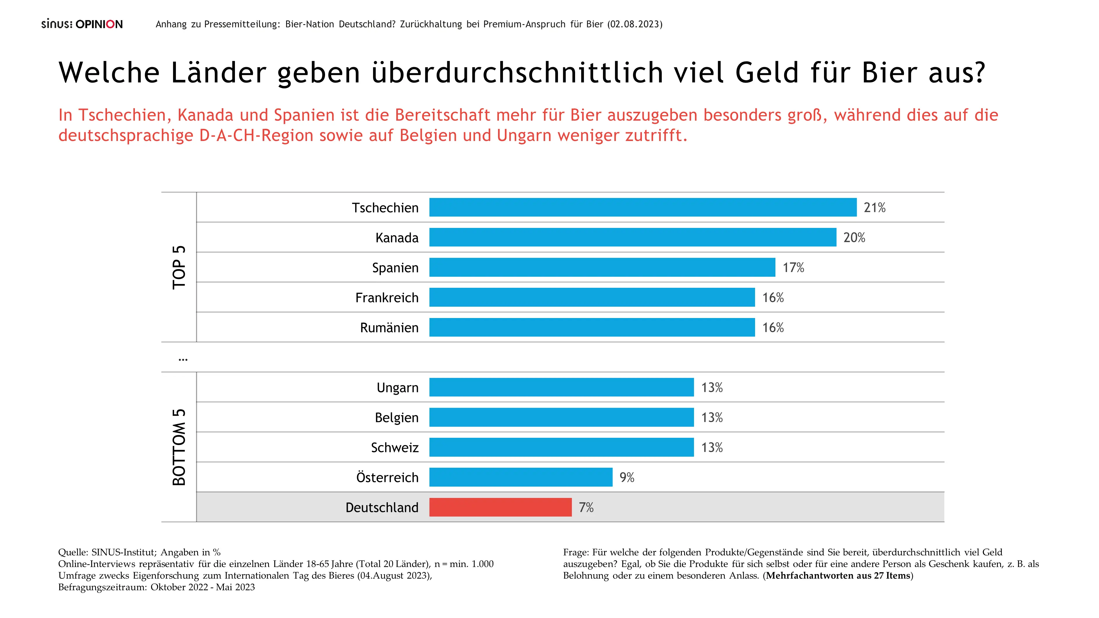 Den Deutschen scheint ihr Bier heilig zu sein, entsprechend preissensibel ist die Bevölkerung. In anderen Märkten ist die Bereitschaft für Bier überdurchschnittlich viel Geld auszugeben deutlich höher, etwa in Tschechien (21%), Kanada (20%), Spanien (17%) und Frankreich (16%) trifft ein Preis-Premium für Bier auf höhere Akzeptanz. Die Zurückhaltung ist aber kein rein deutsches Phänomen: Der Premium-Anspruch ist in allen deutschsprachigen Ländern deutlich geringer (Deutschland: 7%, Österreich: 9%, Schweiz: 13%).