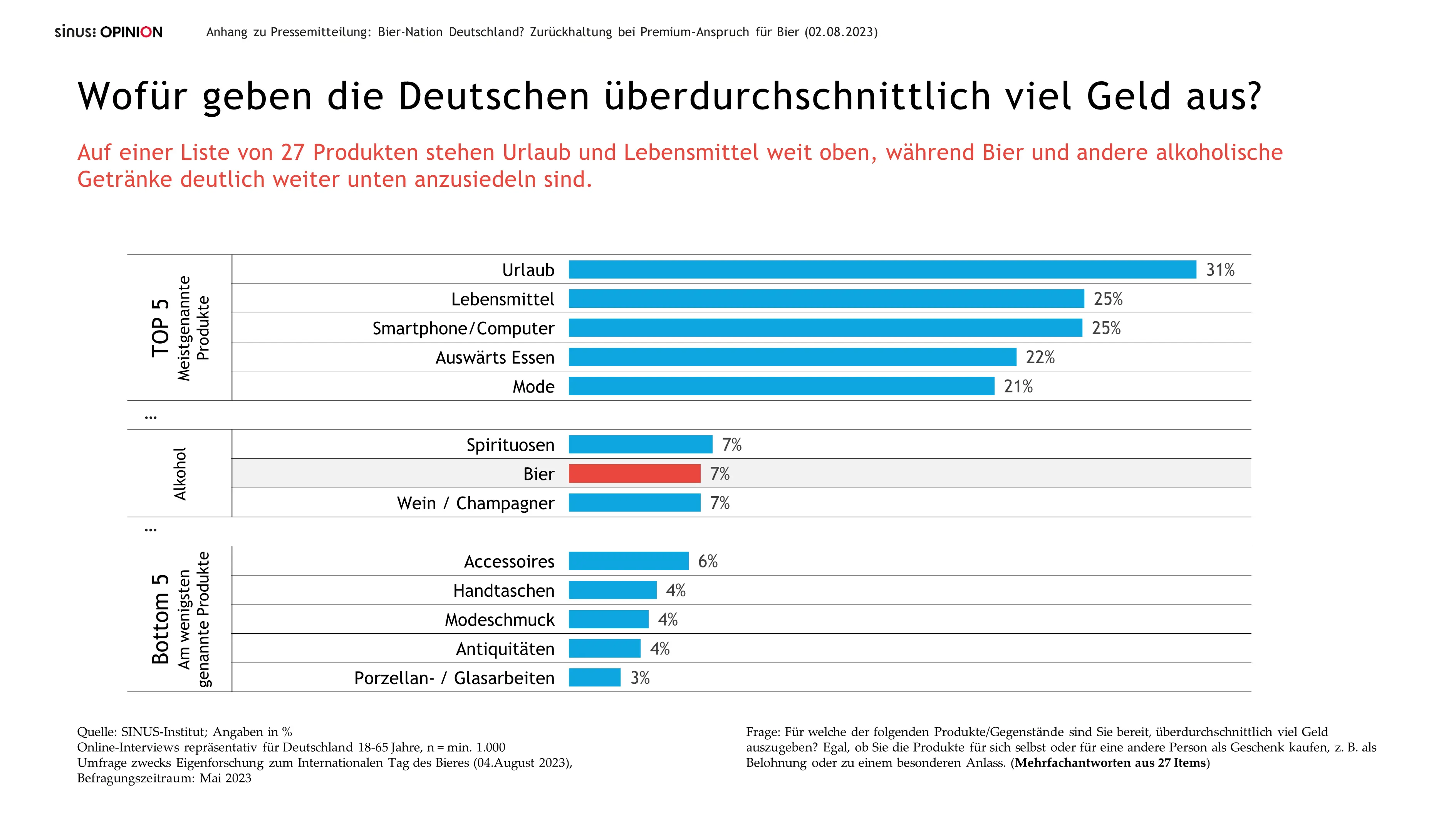 Demnach geben nur 7% der Befragten nach eigenem Empfinden überdurchschnittlich viel Geld für Bier aus, womit das alkoholische Getränk auf Platz 19 von 27 Produkten landet. Das bedeutet, dass nur wenige Befragte ihre Ausgaben für Bier als deutlich unterschiedlich zu ihrem Umfeld wahrnehmen. Generell ist der Premium-Anspruch für Alkoholika für die Deutschen nicht übermäßig hoch, denn Wein (6%) und hochwertige Spirituosen wie Whiskey (7%) schneiden ähnlich niedrig ab. Die größte Bereitschaft für Mehrausgaben besteht hingegen bei Urlaub (31%), Lebensmitteln für den Alltag (25%), Elektrogeräten wie PC oder Smartphone (25%), Restaurantbesuchen (22%) und Mode (21%).
