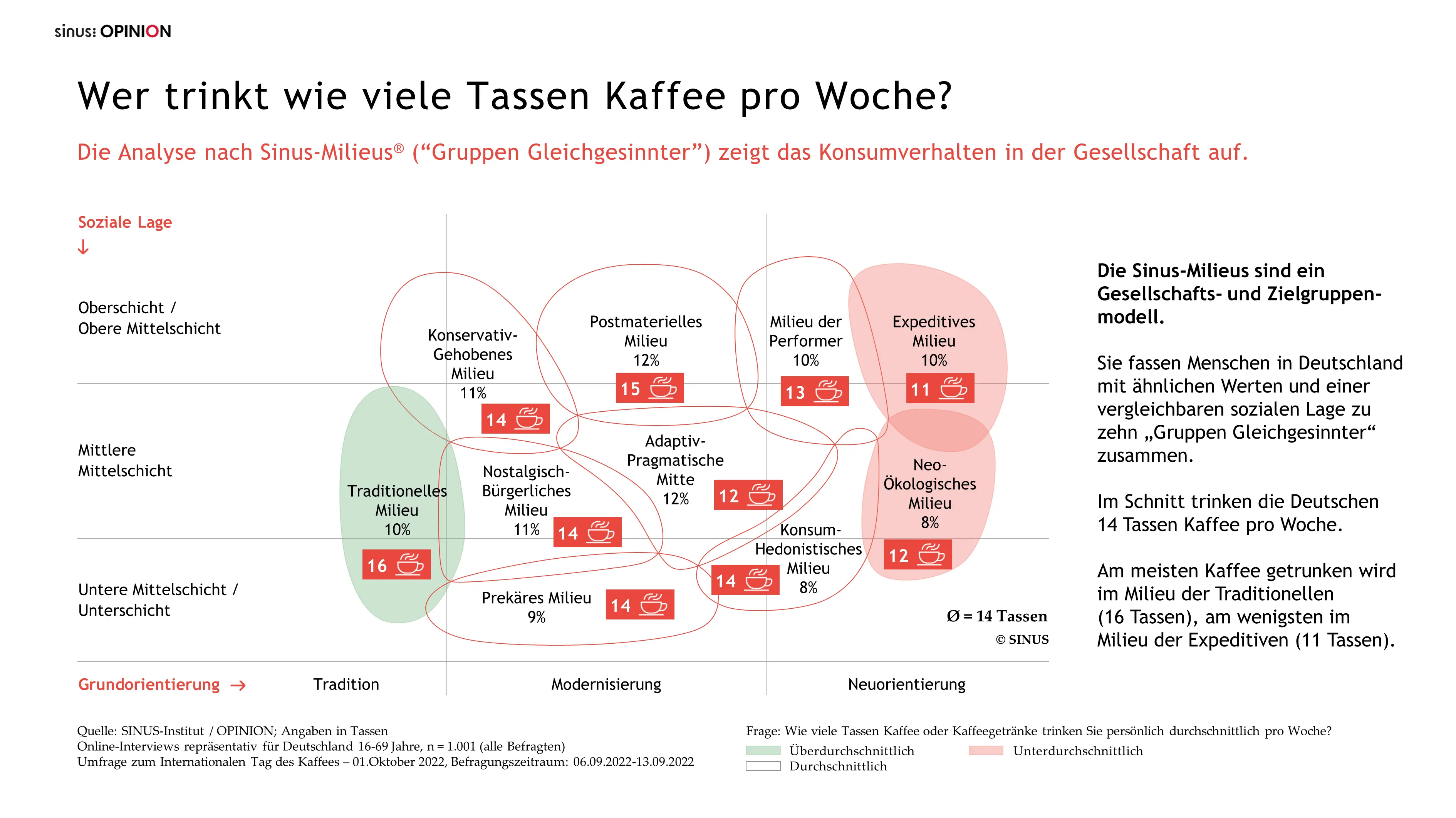 Auch der Kaffeekonsum lässt sich auf der Milieu-Landkarte verorten. Am meisten Kaffee getrunken wird im Milieu der Traditionellen, der Sicherheit und Ordnung liebenden älteren Generation. Am anderen Ende der Skala befindet sich das Milieu der Expeditiven, die ambitionierte kreative Bohème der Gesellschaft. Sie konsumieren die wenigsten Tassen pro Woche im Milieuvergleich.