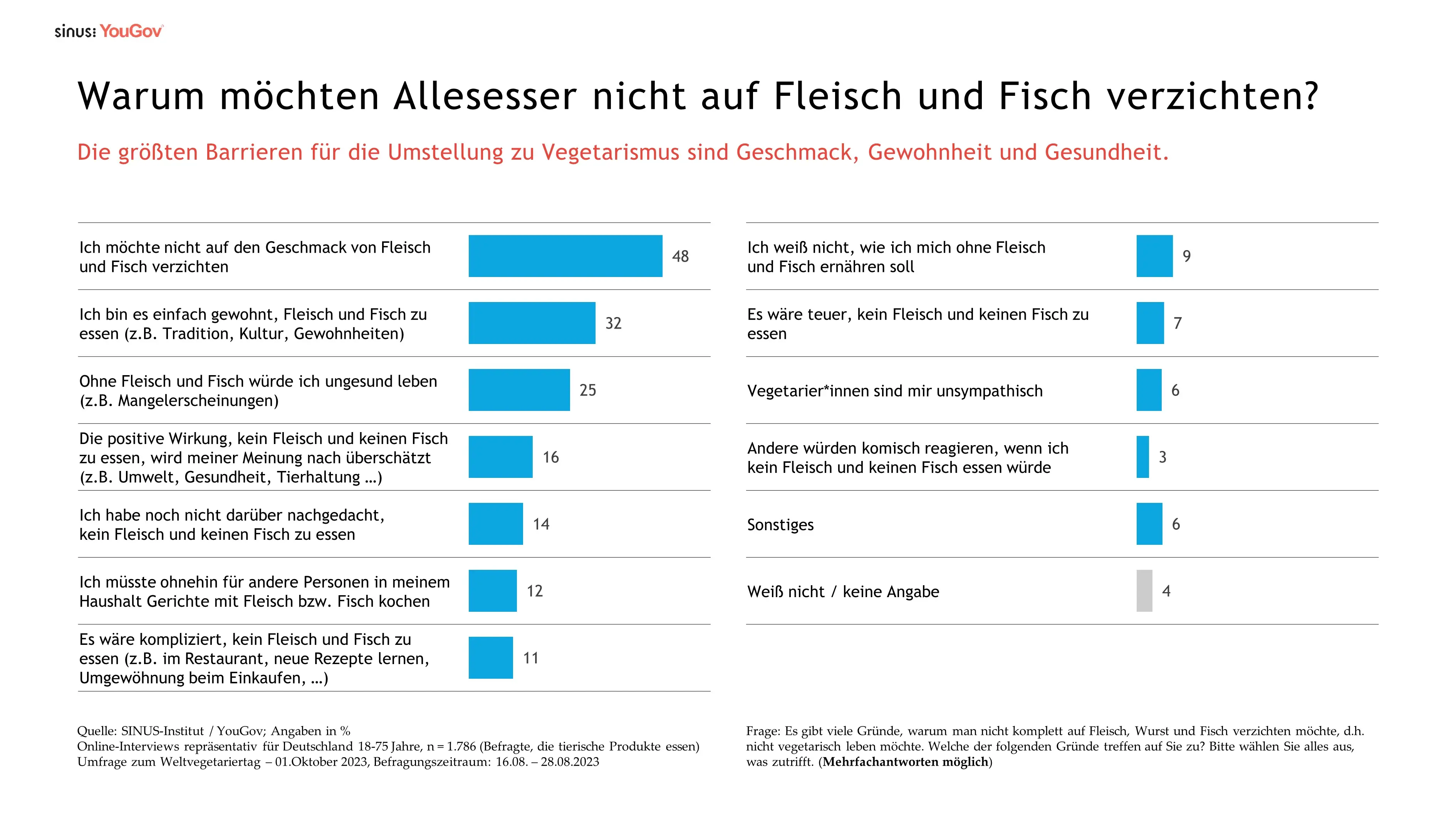 Menschen, die Fleisch und Fisch essen, nennen vielfältige Gründe, weshalb sie nicht darauf verzichten möchten. Am häufigsten werden der unverzichtbare Geschmack von Fleisch und Fisch (48%), Ernährungsgewohnheiten durch Tradition oder Kultur (32%) und die Sorge vor einer ungesunden Mangel-Ernährung (25%) angeführt. Andere Gründe sind jeweils nur für eine Minderheit ausschlaggebend, z.B. fehlendes Wissen zu Vegetarismus, soziale Faktoren wie das Verhalten des Umfeldes in Bezug auf den eigenen Verzicht, oder mögliche Herausforderungen im Alltag durch die Umstellung der Ernährungsweise.