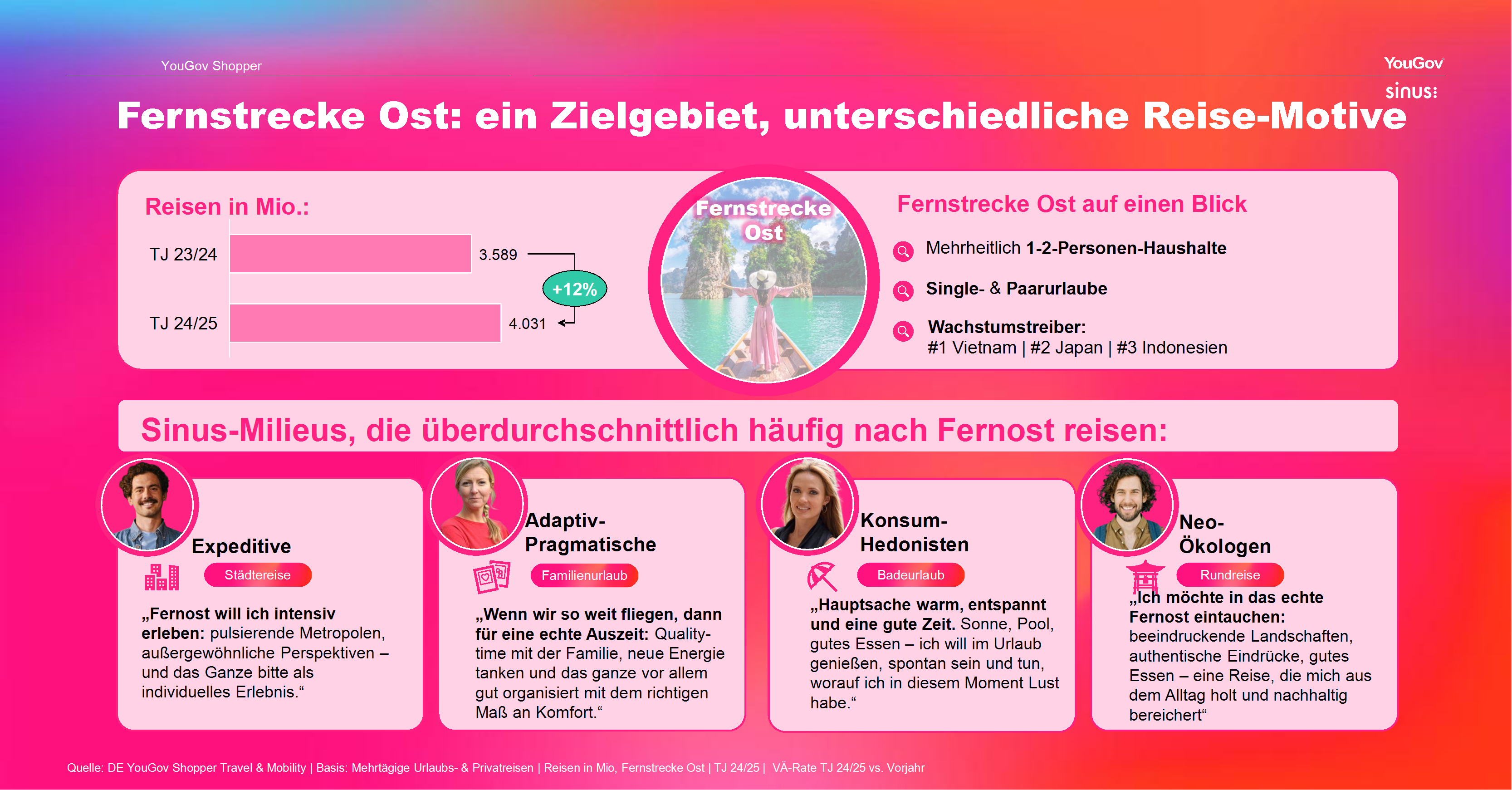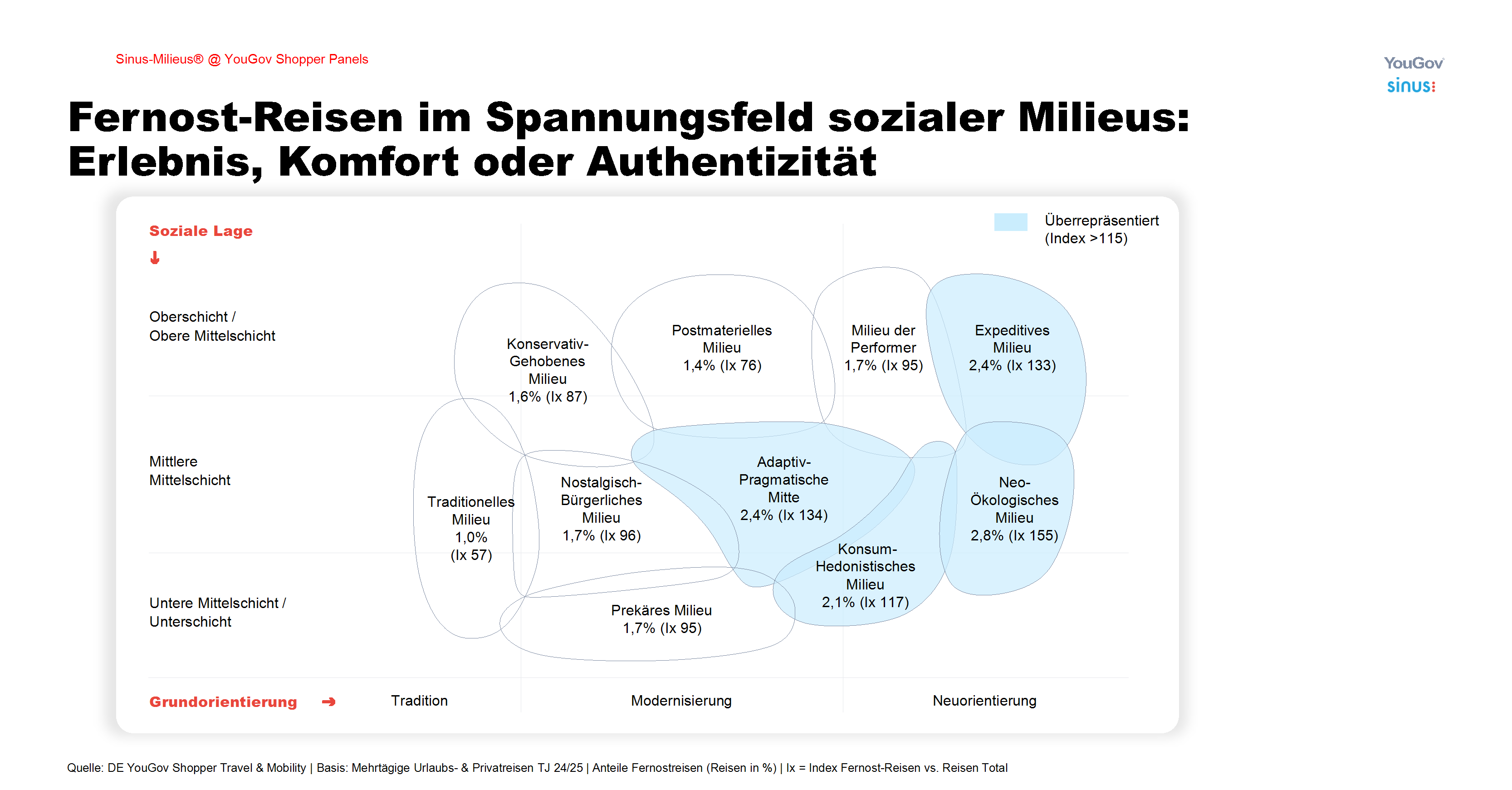 „Vier Milieus weisen einen überdurchschnittlichen Anteil an Fernost-Reisen auf. Trotz identischer Destination unterscheiden sich Motive, Reiseformen und Bedeutungszuschreibungen je nach Zielgruppe deutlich. Im YouGov Travel & Mobility Panel sind echte Reisedaten mit den Sinus-Milieus verknüpft. Die Daten zeigen nicht nur, wer sich für welche Ziele und Reisearten entscheidet – sondern auch, wie Werte und Lebenswelten das Reiseverhalten prägen“, sagt Jan Hecht, Director Research & Consulting beim SINUS-Institut.