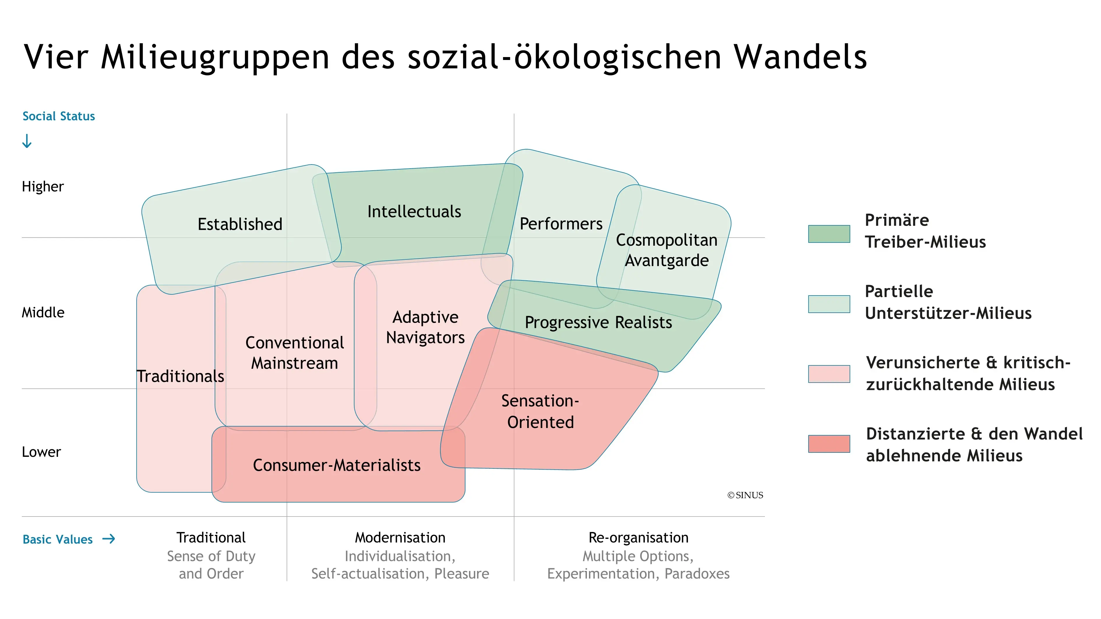 Für eine eingehendere Analyse wurde das internationale Zielgruppen- und Gesellschaftsmodell der Sinus-Meta-Milieus in die Länderbefragungen integriert. Durch die soziokulturelle Differenzierung konnte herausgearbeitet werden, welche sozialen Milieus für klimapolitische Maßnahmen (besonders) empfänglich sind und welche Bevölkerungsgruppen einen sozial-ökologischen Wandel kritisch-zurückhaltend bis ablehnend gegenüberstehen.
