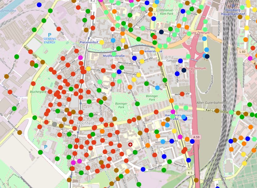 Prekäres Milieu | Die um Orientierung und Teilhabe bemühte Unterschicht: Dazugehören und Anschlusshalten an den Lebensstandard der breiten Mitte – aber Häufung sozialer Benachteiligungen und Ausgrenzungen; Gefühl des Abgehängtseins, Verbitterung und Ressentiments; Selbstbild als robuste Durchbeißer Beispielkarte: Duisburg-Hochfeld |